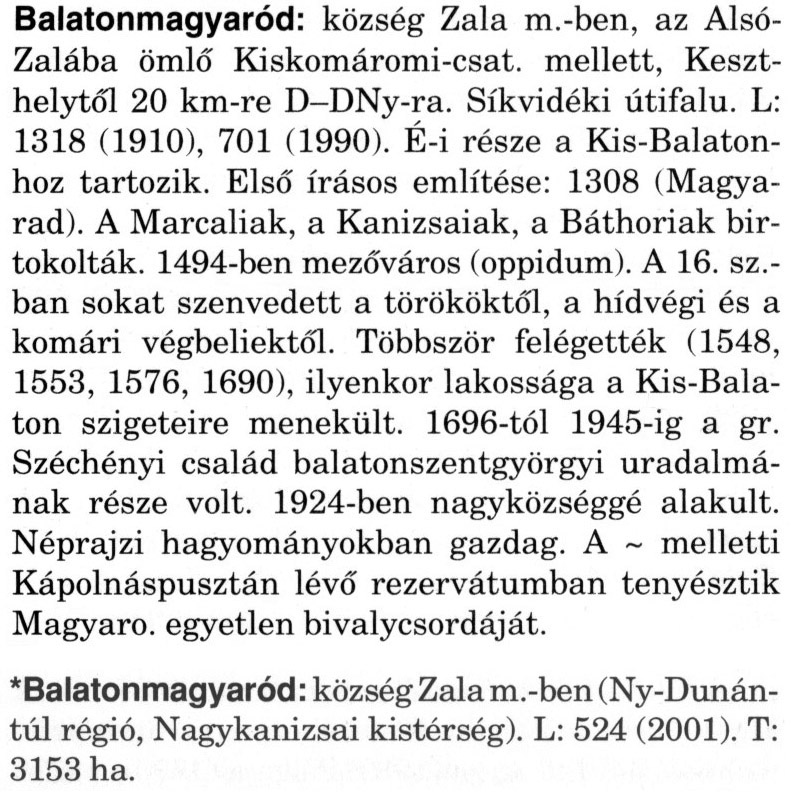 Nyilvános 2337 | 6221 | A szócikkek felismertetett szövege: | (A csillag után a kiegészítő kötetből származó szöveg következik) Balatonmagyaród: község Zala m.-ben, az Alsó-Zalába ömlő Kiskomáromi-csat. mellett, Keszthelytől 20 km-re D–DNy-ra. Síkvidéki útifalu. L: 1318 (1910), 701 (1990). É-i része a Kis-Balatonhoz tartozik. Első írásos említése: 1308 (Magya-rad). A Marcaliak, a Kanizsaiak, a Báthoriak birtokolták. 1494-ben mezőváros (oppidum). A 16. sz.-ban sokat szenvedett a törököktől, a hídvégi és a komári végbeliektől. Többször felégették (1548, 1553, 1576, 1690), ilyenkor lakossága a Kis-Balaton szigeteire menekült. 1696-tól 1945-ig a gr. Széchényi család balatonszentgyörgyi uradalmának része volt. 1924-ben nagyközséggé alakult. Néprajzi hagyományokban gazdag. A ~ melletti Kápolnáspusztán lévő rezervátumban tenyésztik Magyaro. egyetlen bivalycsordáját. *Balatonmagyaród: község Zala m.-ben (Ny-Dunán-túl régió, Nagykanizsai kistérség). L: 524 (2001). T: 3153 ha. A szócikkek a következő lexikonból származnak: Cím: Magyar nagylexikon Közreműködő: Élesztős László (1949) (szerk.) ; Barabás Éva (1943) (szerk.) ; Berényi Gábor (1946) (szerk.) ; Bárány Lászlóné (szerk.) ; Adelmann-né Kertész Judit (1945) (közrem.) ; Froemel Károlyné Jáky Éva (1936) (közrem.) ; Akadémiai Kiadó és Nyomda Vállala Szerz. közl.: [... Élesztős László főszerk.] ; [szerk. Barabás Éva et al.] ; [bibliogr. Adelmanné Kertész Judit] ; [kész. az Akadémiai Kiadó Magyar Nagylexikon Szerkesztőségében] Kiadás: Budapest : Akad. K., 1993- Kötetei: 1. köt., A - Anc 2. köt., And - Bag 3. köt., Bah - Bij 4. köt., Bik - Bz 5. köt., C - Csem 6. köt., Csen - Ec 7. köt., Ed - Fe 8. köt., Ff - Gyep 9. köt., Gyer - Iq 10. köt., Ir - Kip 11. köt., Kir - Lem 12. köt., Len - Mep 13. köt., Mer - Nyk 14. köt., Nyl - Pom 15. köt., Pon - Sek 16. köt., Sel - Szö 17. köt., Szp - Ung 18. köt., Unh - Z 19. köt., Kiegészítő kötet, A - Z ETO jelzet: 030=945.11 Szakjelzet: 030 Cutter: M 14 ISBN: 963-05-6611-7 [!ISBN 963-05-6615-X] Nyelv: magyar Megjegyzés: Az 5. kötettől kiad. a Magyar Nagylexikon Kiadó ; A 6. kötettől főszerk. Berényi Gábor ; A 6. kötettől szakszerk. Bárány Lászlóné et al. ; A 6. kötettől bibliogr. Froemel Károlyné ; Bibliogr. a szócikkek végén |