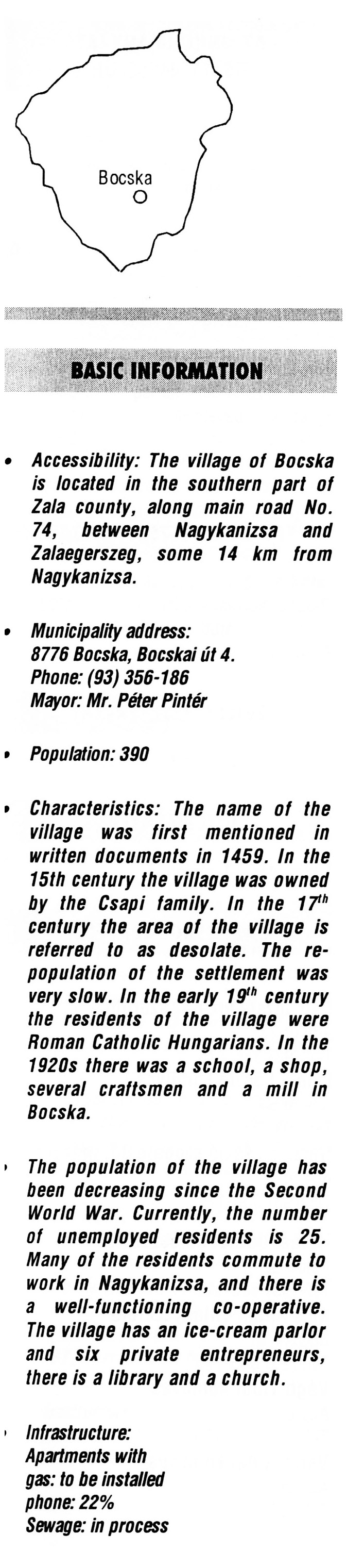 Nyilvános 2360 | 6352 | Bocska | BASIC INFORMATION Accessibility: The village of Bocska is located in the southern part of Zala county, along main road No. 74, between Nagykanizsa and Zalaegerszeg, some 14 km from Nagykanizsa. Municipality address: 8776 Bocska, Bocskai út 4. Phone: (93) 356-186 Mayor: Mr. Péter Pintér Population: 390 Characteristics: The name of the village was first mentioned in written documents in 1459. In the 15th century the village was owned by the Csapi family. In the 17th century the area of the village is referred to as desolate. The re-population of the settlement was very slow. In the early 19th century the residents of the village were Roman Catholic Hungarians. In the 1920s there was a school, a shop, several craftsmen and a mill in Bocska. The population of the village has been decreasing since the Second World War. Currently, the number of unemployed residents is 25. Many of the residents commute to work in Nagykanizsa, and there is a well-functioning co-operative. The village has an ice-cream parlor and six private entrepreneurs, there is a library and a church. Infrastructure: Apartments with gas: to be installed phone: 22% Sewage: in process This text came from the following book: Title: Handbook of Zala county (Zala megye kézikönyve) Series: County handbooks of Hungary (Magyarország megyei kézikönyvei) Chief editor: Hóbor József Publisher: (Hatvan), CEBA-Hungary Ltd, 1998 ETO: 908.439.121(035) ; 050.8(439.121) ISBN: 963-9089-18-2 Pages: 488-1040 p. Remark: Closed on: 1998. márc. 31. |