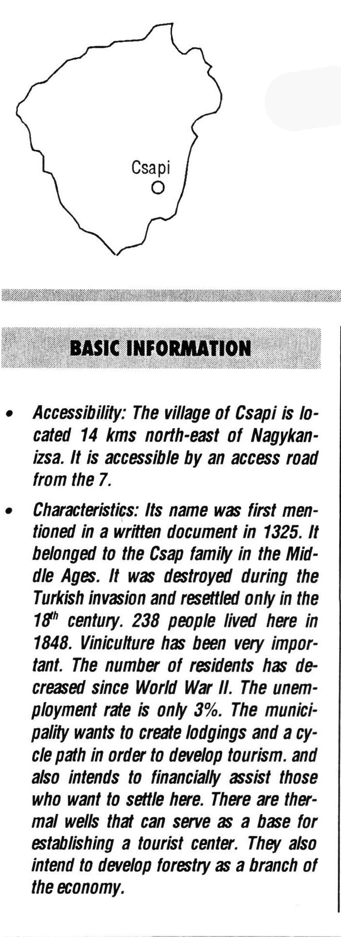 Nyilvános 2413 | 7982 | Csapi | BASIC INFORMATION • Accessibility: The village of Csapi is located 14 kms north-east of Nagykanizsa. It is accessible by an access road from the 7. • Characteristics: Its name was first mentioned in a written document in 1325. It belonged to the Csap family in the Middle Ages. It was destroyed during the Turkish invasion and resettled only in the 18th century. 238 people lived here in 1848. Viniculture has been very important. The number of residents has decreased since World War II. The unemployment rate is only 3%. The municipality wants to create lodgings and a cycle path in order to develop tourism, and also intends to financially assist those who want to settle here. There are thermal wells that can serve as a base for establishing a tourist center. They also intend to develop forestry as a branch of the economy. This text came from the following book: Title: Handbook of Zala county (Zala megye kézikönyve) Series: County handbooks of Hungary (Magyarország megyei kézikönyvei) Chief editor: Hóbor József Publisher: (Hatvan), CEBA-Hungary Ltd, 1998 ETO: 908.439.121(035) ; 050.8(439.121) ISBN: 963-9089-18-2 Pages: 488-1040 p. Remark: Closed on: 1998. márc. 31. |