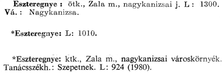 Nyilvános 2445 | 6512 | A szócikkek felismertetett szövege: | (Az első csillag után az 1972-es, a második csillag után az 1981-es kiadású kiegészítő kötetből származó szöveg következik) Eszteregnye : ötk., Zala m., nagykanizsai j. L : 1300. Vá. : Nagykanizsa. *Eszteregnye: L: 1010. *Eszteregnye: ktk., Zala m., nagykanizsai városkörnyék. Tanácsszékh.: Szepetnek. L: 924 (1980). A szócikkek a következő lexikonból származnak: Cím: Új magyar lexikon Közreműködő: Berei Andor (1900-1979) (szerk.) Szerz. közl.: [szerk. Berei Andor et al.] Kiadás jelzés: 2. lny. Kiadás: Budapest : Akad. K., 1961-1962 Kötetei: 1., A - C 2., D - F 3., G - J 4., K - Me 5., Mf - R 6., S - Z 7. köt., A-Z Kiegészítő kötet (1972) Kiegészítő kötet, 1962÷1980 (1981) ETO jelzet: 03=945.11 Szakjelzet: 030 Cutter: U 28 Nyelv: magyar Megjegyzés: Bibliogr. a címszavak egy részének végén |