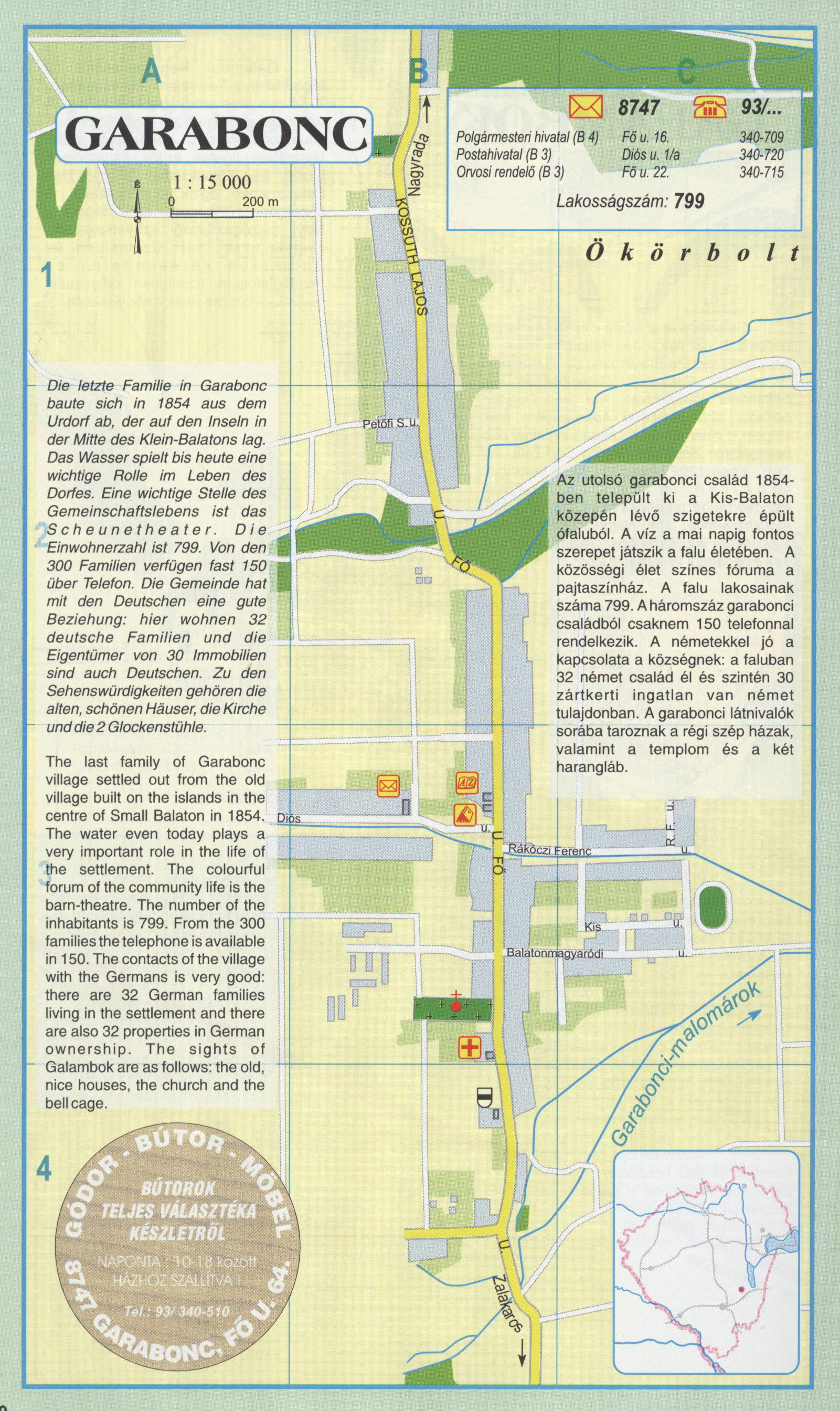 Nyilvános 2470 | 9413 | Garabonc | Az utolsó garabonci család 1854-ben települt ki a Kis-Balaton közepén lévő szigetekre épült ófaluból. A víz a mai napig fontos szerepet játszik a falu életében. A közösségi élet színes fóruma a pajtaszínház. A falu lakosainak száma 799. A háromszáz garabonci családból csaknem 150 telefonnal rendelkezik. A németekkel jó a kapcsolata a községnek: a faluban 32 német család él és szintén 30 zártkerti ingatlan van német tulajdonban. A garabonci látnivalók sorába taroznak a régi szép házak, valamint a templom és a két harangláb. Die letzte Familie in Garabonc baute sich in 1854 aus dem Urdorf ab, der auf den Inseln in der Mitte des Klein-Balatons lag. Das Wasser spielt bis heute eine wichtige Rolle im Leben des Dorfes. Eine wichtige Stelle des Gemeinschaftslebens ist das Scheunetheater. Die Einwohnerzahl ist 799. Von den 300 Familien verfügen fast 150 über Telefon. Die Gemeinde hat mit den Deutschen eine gute Beziehung: hier wohnen 32 deutsche Familien und die Eigentümer von 30 Immobilien sind auch Deutschen. Zu den Sehenswürdigkeiten gehören die alten, schönen Häuser, die Kirche und die 2 Glockenstühle. The last family of Garabonc village settled out from the old village built on the islands in the centre of Small Balaton in 1854. The water even today plays a very important role in the life of the settlement. The colourful forum of the community life is the barn-theatre. The number of the inhabitants is 799. From the 300 families the telephone is available in 150. The contacts of the village with the Germans is very good: there are 32 German families living in the settlement and there are also 32 properties in German ownership. The sights of Galambok are as follows: the old, nice houses, the church and the bell cage. A részlet a következő kiadványból származik/Die Teile stammen vom volgenden Buch/This text came from the following book: Cím/Titel/Title: Zala megye településeinek atlasza - 257 település részletes térképe/Atlas der Komitat Zala - 257 Detailte Siedlungskarten/Zala county's Atlas - 257 settlement maps. Közreműködő/contributor: Lackner László (1943) (fotó) Kiadás/Ausgabe/Publisher: Gyula : HISZI-MAP, 1997 Sorozat/Serie/Series: Indulástól - megérkezésig... ETO: 912(439.121-2) ; 908.439.121 Cutter: Z 19 ISBN: 963-610-025-4 Oldalszám/Seiten/Pages: 323, 81 p. Megjegyzés/Note: Lezárva/Abgeschlossen am/Closed am: 1997. máj. 30. |