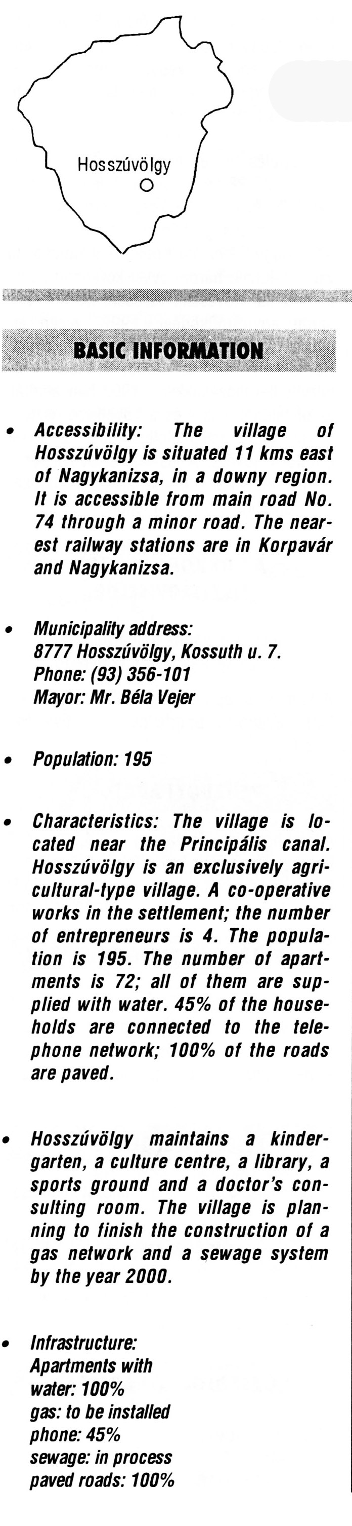 Nyilvános 2245 | 6377 | Hosszúvölgy | BASIC INFORMATION Accessibility: The village of Hosszúvölgy is situated 11 kms east of Nagykanizsa, in a downy region. It is accessible from main road No. 74 through a minor road. The nearest railway stations are in Korpavár and Nagykanizsa. Municipality address: 8777 Hosszúvölgy, Kossuth u. 7. Phone: (93) 356-101 Mayor: Mr. Béla Vejer Population: 195 Characteristics: The village is located near the Principális canal. Hosszúvölgy is an exclusively agricultural-type village. A co-operative works in the settlement; the number of entrepreneurs is 4. The population is 195. The number of apartments is 72; all of them are supplied with water. 45% of the households are connected to the telephone network; 100% of the roads are paved. • Hosszúvölgy maintains a kindergarten, a culture centre, a library, a sports ground and a doctor\'s consulting room. The village is planning to finish the construction of a gas network and a sewage system by the year 2000. • Infrastructure: Apartments with water: 100% gas: to be installed phone: 45% sewage: in process paved roads: 100% This text came from the following book: Title: Handbook of Zala county (Zala megye kézikönyve) Series: County handbooks of Hungary (Magyarország megyei kézikönyvei) Chief editor: Hóbor József Publisher: (Hatvan), CEBA-Hungary Ltd, 1998 ETO: 908.439.121(035) ; 050.8(439.121) ISBN: 963-9089-18-2 Pages: 488-1040 p. Remark: Closed on: 1998. márc. 31. |