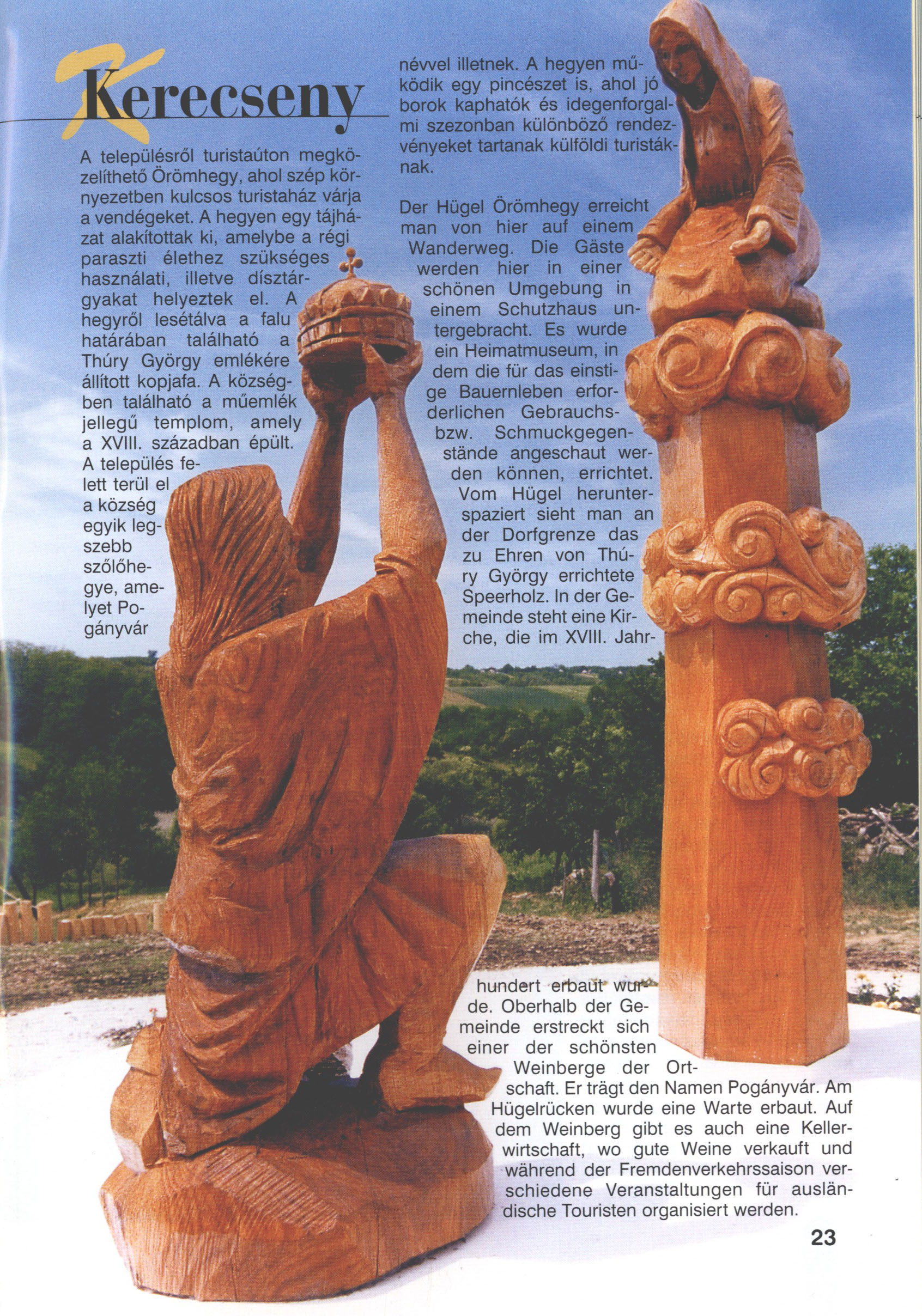 Nyilvános 2380 | 6228 | Kerecseny | Der Hügel Örömhegy erreicht man von hier auf einem Wanderweg. Die Gäste werden hier in einer schönen Umgebung in einem Schutzhaus untergebracht. Es wurde ein Heimatmuseum, in dem die für das einstige Bauernleben erforderlichen Gebrauchs bzw. Schmuckgegenstände angeschaut werden können, errichtet. Vom Hügel herunterspaziert sieht man an der Dorfgrenze das zu Ehren von Thúry György errichtete Speerholz. In der Gemeinde steht eine Kirche, die im XVIII. Jahrhundert erbaut wurde. Oberhalb der Gemeinde erstreckt sich einer der schönsten Weinberge der Ortschaft. Er trägt den Namen Pogányvár. Am Hügelrücken wurde eine Warte erbaut. Auf dem Weinberg gibt es auch eine Kellerwirtschaft, wo gute Weine verkauft und während der Fremdenverkehrssaison verschiedene Veranstaltungen für ausländische Touristen organisiert werden. Dieses Text stammt von: Titel: Hívogató a Régiók Kapujában - Útikönyv Látnivalók Nagykanizsán és Térségében (Einladend in dem Tor des Gebiets - Reisebuch - Sehenswürdigkeiten in Nagykanizsa und Umgebung) Herausgegeben von: Nagykanizsa és a Környező Települések Területfejlesztési Társulása (Verein für Gebietsentwicklung in Nagykanizsa und in ihrer Umgebung) 8800 Nagykanizsa, Petőfi Sándor út 5. Tel.: 06 93/536-453 • 06 93/536-454 Tel ./Fax: 06 93/326-323 E-mail: terstars@axelero.hu www.kanizsaterseg.celodin.hu |