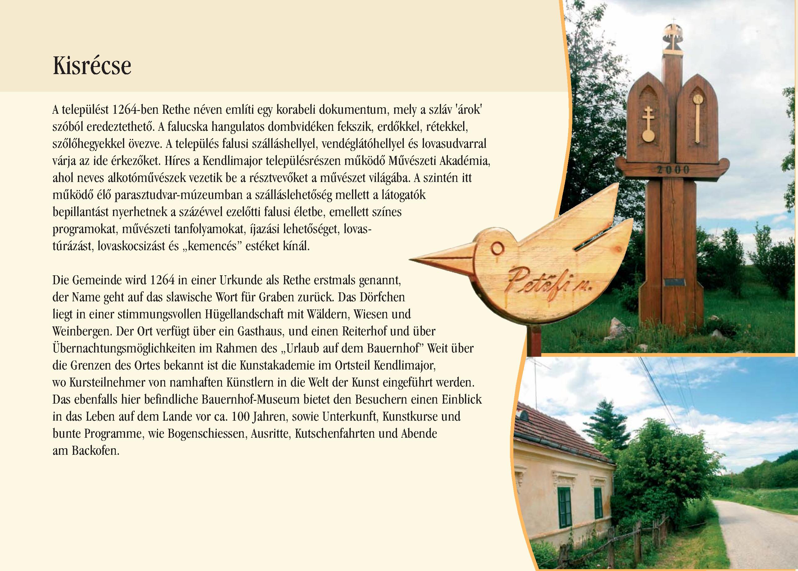 Nyilvános 2300 | 6565 | Kisrécse | Die Gemeinde wird 1264 in einer Urkunde als Rethe erstmals genannt, der Name geht auf das slawische Wort für Graben zurück. Das Dörfchen liegt in einer stimmungsvollen Hügellandschaft mit Wäldern, Wiesen und Weinbergen. Der Ort verfügt über ein Gasthaus, und einen Reiterhof und über Übernachtungsmöglichkeiten im Rahmen des ,,Urlaub auf dem Bauernhof" Weit über die Grenzen des Ortes bekannt ist die Kunstakademie im Ortsteil Kendlimajor, wo Kursteilnehmer von namhaften Künstlern in die Welt der Kunst eingeführt werden. Das ebenfalls hier befindliche Bauernhof-Museum bietet den Besuchern einen Einblick in das Leben auf dem Lande vor ca. 100 Jahren, sowie Unterkunft, Kunstkurse und bunte Programme, wie Bogenschiessen, Ausritte, Kutschenfahrten und Abende am Backofen. Dieses Text stammt von: Pannonhát tájpark prospektus 2006. Web: http://www.pannonhat.hu/ (auch in Deutsch) |