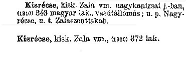 Nyilvános 2206 | 5751 | Cím: Révai nagy lexikona | Alcím: az ismeretek enciklopédiája Kiadás: Budapest : Révai testvérek, [1911]- Kötetei: 1. köt., A - Arany 2. köt., Arány - Beke 3. köt., Béke - Brutto 4. köt., Bratus - Csát 5. köt., Csata - Duc 6. köt., Duc - Etele 7. köt., Stelka - Földöv 8. köt., Földpálya - Gres 9. köt., Gréc - Herold 10. köt., Hérold - Jób 11. köt., Jób - Nontur 12. köt., Kontúr - Lovas 13. köt., Lovas - Mons 14. köt., Mens - Ottó 15. köt., Ottó - Racine 16. köt., Racine - Sodoma 17. köt., Sodoma - Tarján 18. köt., 19. köt., Vár - Zsüri | Kiegészítés Aachen - Beöthy 20. köt., Kiegészítés: Bér - Zsolt ETO jelzet: 03=945.11 Szakjelzet: 030 Cutter: R 62 Nyelv: magyar Kisrécse kisk. Zala vm. nagykanizsai j. -ban, (1910) 343 magyar lak., vasútállomás; u. p. Nagyrécse, u. t. Zalaszentjakab. Kisrécse kisk. Zala, vm. (1920) 372 lak. |