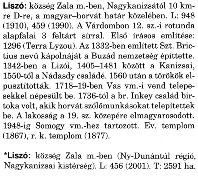 Nyilvános 2520 | 6761 | A szócikkek felismertetett szövege: | (A csillag után a kiegészítő kötetből származó szöveg következik) Liszó: község Zala m.-ben, Nagykanizsától 10 km-re D-re, a magyar–horvát határ közelében. L: 948 (1910), 459 (1990). A Várdombon 12. sz.-i rotunda alapfalai 3 feltárt sírral. Első írásos említése: 1296 (Terra Lyzou). Az 1332-ben említett Szt. Bric-tius nevű kápolnáját a Buzád nemzetség építtette. 1342-ben a Lizói, 1405-1481 között a Kanizsai, 1550-től a Nádasdy családé. 1560 után a törökök elpusztították. 1718–19-ben Vas vm.-i vend telepesekkel népesült be. 1736-tól a br. Inkey család birtoka volt, akik horvát szőlőmunkásokat telepítettek be. A lakosság a 19. sz. közepére elmagyarosodott. 1948-ig Somogy vm.-hez tartozott. Ev. templom (1867), r. k. templom (1877). *Liszó: község Zala m.-ben (Ny-Dunántúl régió, Nagykanizsai kistérség). L: 456 (2001). T: 2591 ha. A szócikkek a következő lexikonból származnak: Cím: Magyar nagylexikon Közreműködő: Élesztős László (1949) (szerk.) ; Barabás Éva (1943) (szerk.) ; Berényi Gábor (1946) (szerk.) ; Bárány Lászlóné (szerk.) ; Adelmann-né Kertész Judit (1945) (közrem.) ; Froemel Károlyné Jáky Éva (1936) (közrem.) ; Akadémiai Kiadó és Nyomda Vállala Szerz. közl.: [... Élesztős László főszerk.] ; [szerk. Barabás Éva et al.] ; [bibliogr. Adelmanné Kertész Judit] ; [kész. az Akadémiai Kiadó Magyar Nagylexikon Szerkesztőségében] Kiadás: Budapest : Akad. K., 1993- Kötetei: 1. köt., A - Anc 2. köt., And - Bag 3. köt., Bah - Bij 4. köt., Bik - Bz 5. köt., C - Csem 6. köt., Csen - Ec 7. köt., Ed - Fe 8. köt., Ff - Gyep 9. köt., Gyer - Iq 10. köt., Ir - Kip 11. köt., Kir - Lem 12. köt., Len - Mep 13. köt., Mer - Nyk 14. köt., Nyl - Pom 15. köt., Pon - Sek 16. köt., Sel - Szö 17. köt., Szp - Ung 18. köt., Unh - Z 19. köt., Kiegészítő kötet, A - Z ETO jelzet: 030=945.11 Szakjelzet: 030 Cutter: M 14 ISBN: 963-05-6611-7 [!ISBN 963-05-6615-X] Nyelv: magyar Megjegyzés: Az 5. kötettől kiad. a Magyar Nagylexikon Kiadó ; A 6. kötettől főszerk. Berényi Gábor ; A 6. kötettől szakszerk. Bárány Lászlóné et al. ; A 6. kötettől bibliogr. Froemel Károlyné ; Bibliogr. a szócikkek végén |