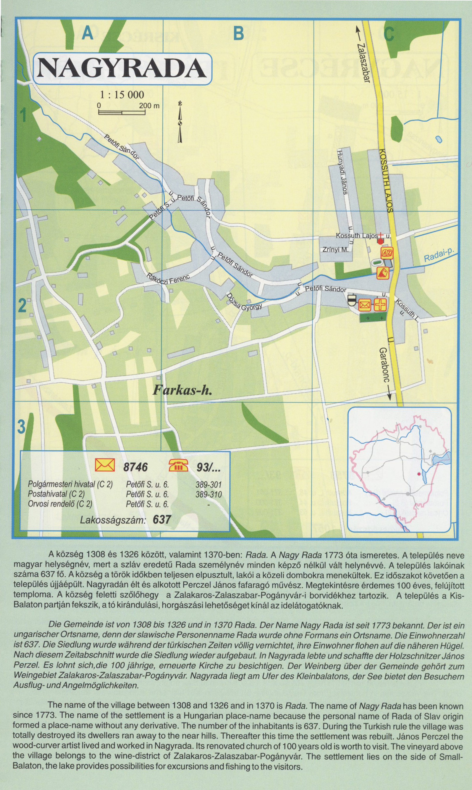 Nyilvános 2436 | 8754 | NAGYRADA | A község 1308 és 1326 között, valamint 1370-ben: Rada. A Nagy Rada 1773 óta ismeretes. A település neve magyar helységnév, mert a szláv eredetű Rada személynév minden képző nélkül vált helynévvé. A település lakóinak száma 637 fő. A község a török időkben teljesen elpusztult, lakói a közeli dombokra menekültek. Ez időszakot követően a település újjáépült. Nagyradán élt és alkotott Perczel János fafaragó művész. Megtekintésre érdemes 100 éves, felújított temploma. A község feletti szőlőhegy a Zalakaros-Zalaszabar-Pogányvár-i borvidékhez tartozik. A település a Kis-Balaton partján fekszik, a tó kirándulási, horgászási lehetőséget kínál az idelátogatóknak. Die Gemeinde ist von 1308 bis 1326 und in 1370 Rada. Der Name Nagy Rada ist seit 1773 bekannt. Der ist ein ungarischer Ortsname, denn der slawische Personenname Rada wurde ohne Formans ein Ortsname. Die Einwohnerzahl ist 637. Die Siedlung wurde während der türkischen Zeiten völlig vernichtet, ihre Einwohner flohen auf die näheren Hügel. Nach diesem Zeitabschnitt wurde die Siedlung wieder aufgebaut. In Nagyrada lebte und schaffte der Holzschnitzer János Perzel. Es lohnt sich,die 100 jährige, erneuerte Kirche zu besichtigen. Der Weinberg über der Gemeinde gehört zum Weingebiet Zalakaros-Zalaszabar-Pogányvár. Nagyrada liegt am Ufer des Kleinbalatons, der See bietet den Besuchern Ausflug-und Angelmöglichkeiten. The name of the village between 1308 and 1326 and in 1370 is Rada. The name of Nagy Rada has been known since 1773. The name of the settlement is a Hungarian place-name because the personal name of Rada of Slav origin formed a place-name without any derivative. The number of the inhabitants is 637. During the Turkish rule the village was totally destroyed its dwellers ran away to the near hills. Thereafter this time the settlement was rebuilt. János Perczel the wood-curver artist lived and worked in Nagyrada. Its renovated church of 100 years old is worth to visit. The vineyard above the village belongs to the wine-district of Zalakaros-Zalaszabar-Pogányvár. The settlement lies on the side of Small-Balaton, the lake provides possibilities for excursions and fishing to the visitors. A részlet a következő kiadványból származik/Die Teile stammen vom volgenden Buch/This text came from the following book: Cím/Titel/Title: Zala megye településeinek atlasza - 257 település részletes térképe/Atlas der Komitat Zala - 257 Detailte Siedlungskarten/Zala county\'s Atlas - 257 settlement maps. Közreműködő/contributor: Lackner László (1943) (fotó) Kiadás/Ausgabe/Publisher: Gyula : HISZI-MAP, 1997 Sorozat/Serie/Series: Indulástól - megérkezésig... ETO: 912(439.121-2) ; 908.439.121 Cutter: Z 19 ISBN: 963-610-025-4 Oldalszám/Seiten/Pages: 323, 81 p. Megjegyzés/Note: Lezárva/Abgeschlossen am/Closed am: 1997. máj. 30. |