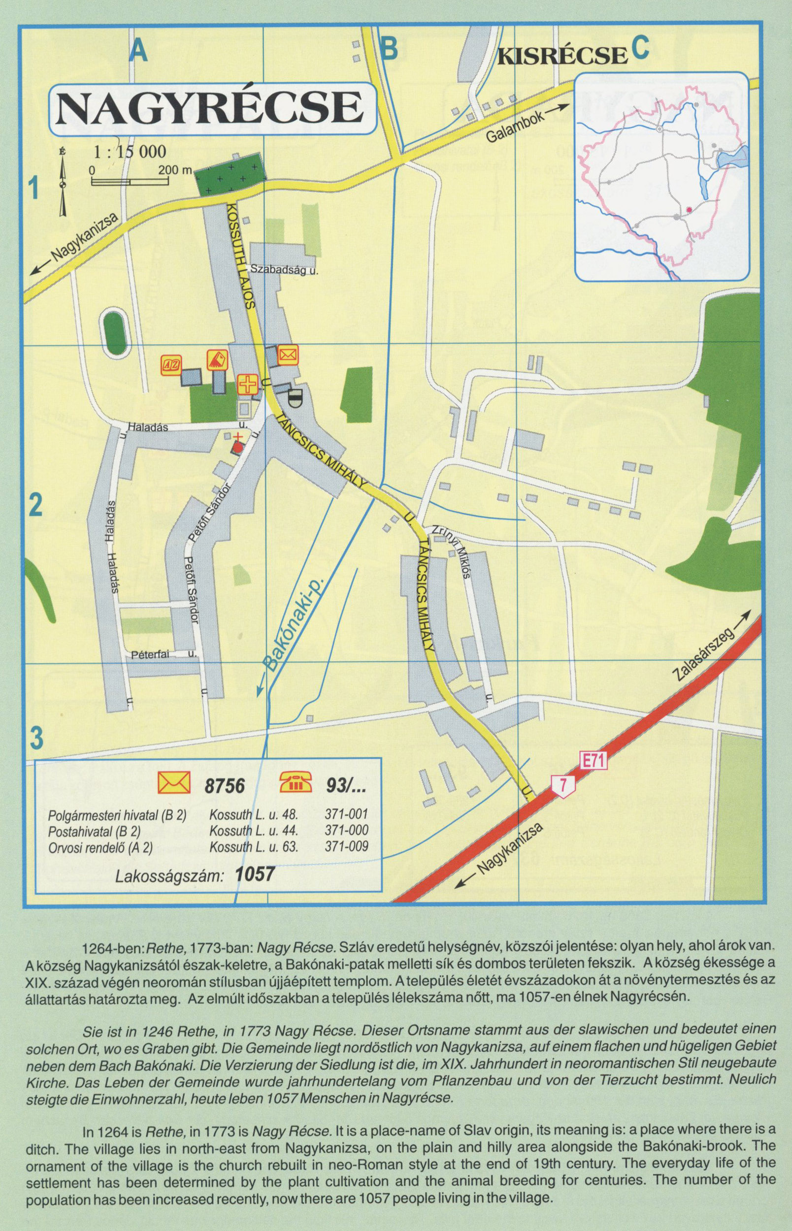 Nyilvános 2600 | 9278 | NAGYRÉCSE | 1264-ben: Rethe, 1773-ban: Nagy Récse. Szláv eredetű helységnév, közszói jelentése: olyan hely, ahol árok van. A község Nagykanizsától észak-keletre, a Bakónaki-patak melletti sík és dombos területen fekszik. A község ékessége a XIX. század végén neoromán stílusban újjáépített templom. A település életét évszázadokon át a növénytermesztés és az állattartás határozta meg. Az elmúlt időszakban a település lélekszáma nőtt, ma 1057-en élnek Nagyrécsén. Sie ist in 1246 Rethe, in 1773 Nagy Récse. Dieser Ortsname stammt aus der slawischen und bedeutet einen solchen Ort, wo es Graben gibt. Die Gemeinde liegt nordöstlich von Nagykanizsa, auf einem flachen und hügeligen Gebiet neben dem Bach Bakónaki. Die Verzierung der Siedlung ist die, im XIX. Jahrhundert in neoromantischen Stil neugebaute Kirche. Das Leben der Gemeinde wurde jahrhundertelang vom Pflanzenbau und von der Tierzucht bestimmt. Neulich steigte die Einwohnerzahl, heute leben 1057 Menschen in Nagyrécse. In 1264 is Rethe, in 1773 is Nagy Récse. It is a place-name of Slav origin, its meaning is: a place where there is a ditch. The village lies in north-east from Nagykanizsa, on the plain and hilly area alongside the Bakónaki-brook. The ornament of the village is the church rebuilt in neo-Roman style at the end of 19th century. The everyday life of the settlement has been determined by the plant cultivation and the animal breeding for centuries. The number of the population has been increased recently, now there are 1057 people living in the village. A részlet a következő kiadványból származik/Die Teile stammen vom volgenden Buch/This text came from the following book: Cím/Titel/Title: Zala megye településeinek atlasza - 257 település részletes térképe/Atlas der Komitat Zala - 257 Detailte Siedlungskarten/Zala county\'s Atlas - 257 settlement maps. Közreműködő/contributor: Lackner László (1943) (fotó) Kiadás/Ausgabe/Publisher: Gyula : HISZI-MAP, 1997 Sorozat/Serie/Series: Indulástól - megérkezésig... ETO: 912(439.121-2) ; 908.439.121 Cutter: Z 19 ISBN: 963-610-025-4 Oldalszám/Seiten/Pages: 323, 81 p. Megjegyzés/Note: Lezárva/Abgeschlossen am/Closed am: 1997. máj. 30. |