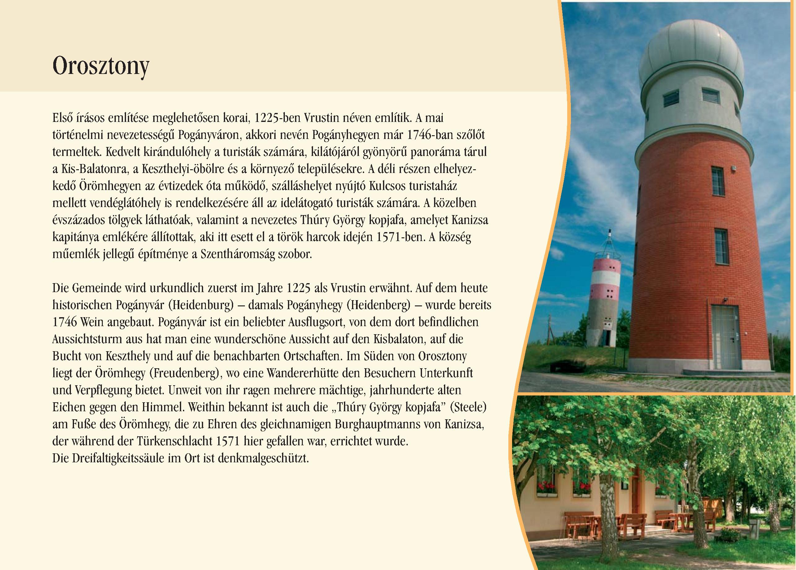 Nyilvános 2471 | 8441 | Orosztony | Die Gemeinde wird urkundlich zuerst im Jahre 1225 als Vrustin erwähnt. Auf dem heute historischen Pogányvár (Heidenburg) damals Pogányhegy (Heidenberg) wurde bereits 1746 Wein angebaut. Pogányvár ist ein beliebter Ausflugsort, von dem dort befindlichen Aussichtsturm aus hat man eine wunderschöne Aussicht auf den Kisbalaton, auf die Bucht von Keszthely und auf die benachbarten Ortschaften. Im Süden von Orosztony liegt der Örömhegy (Freudenberg), wo eine Wandererhütte den Besuchern Unterkunft und Verpflegung bietet. Unweit von ihr ragen mehrere mächtige, jahrhunderte alten Eichen gegen den Himmel. Weithin bekannt ist auch die ,,Thúry György kopjafa" (Steele) am Fuße des Örömhegy, die zu Ehren des gleichnamigen Burghauptmanns von Kanizsa, der während der Türkenschlacht 1571 hier gefallen war, errichtet wurde. Die Dreifaltigkeitssäule im Ort ist denkmalgeschützt. Dieses Text stammt von: Pannonhát tájpark prospektus 2006. Web: http://www.pannonhat.hu/ (auch in Deutsch) |