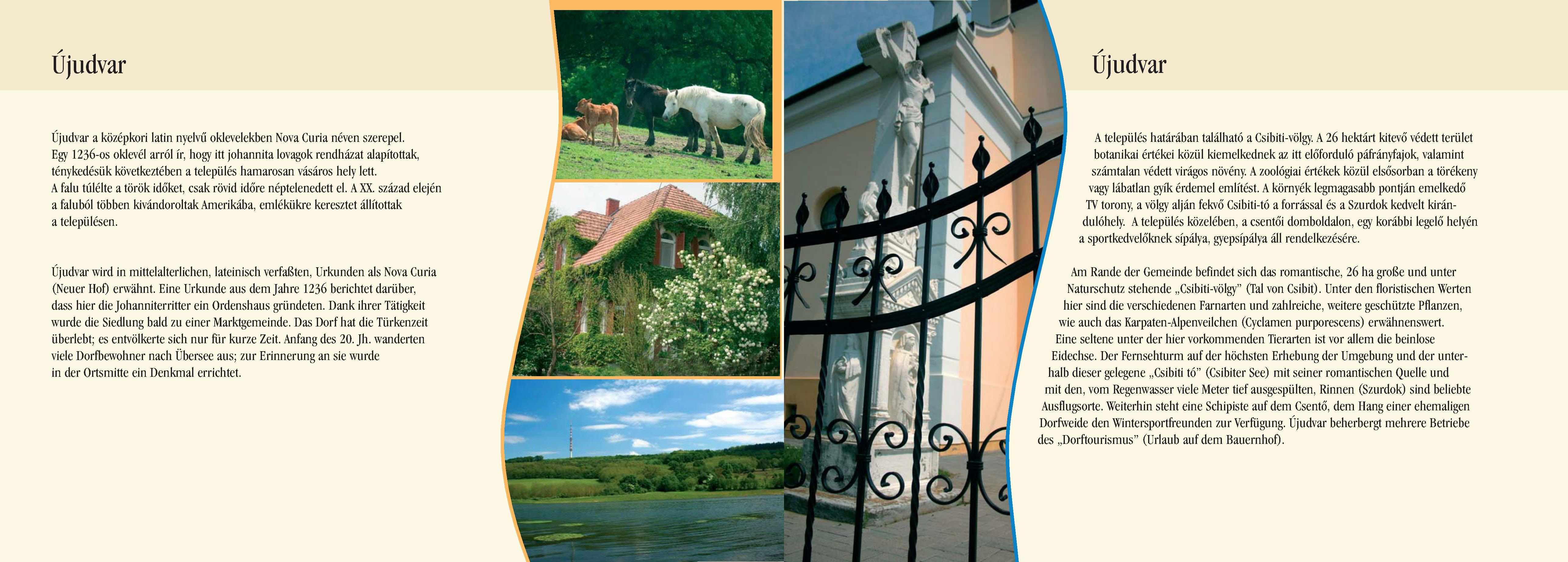 Nyilvános 2149 | 7680 | Újudvar | Újudvar wird in mittelalterlichen, lateinisch verfaßten, Urkunden als Nova Curia (Neuer Hof) erwähnt. Eine Urkunde aus dem Jahre 1236 berichtet darüber, dass hier die Johanniterritter ein Ordenshaus gründeten. Dank ihrer Tätigkeit wurde die Siedlung bald zu einer Marktgemeinde. Das Dorf hat die Türkenzeit überlebt; es entvölkerte sich nur für kurze Zeit. Anfang des 20. Jh. wanderten viele Dorfbewohner nach Übersee aus; zur Erinnerung an sie wurde in der Ortsmitte ein Denkmal errichtet. Am Rande der Gemeinde befindet sich das romantische, 26 ha große und unter Naturschutz stehende ,,Csibiti-völgy" (Tal von Csibit). Unter den floristischen Werten hier sind die verschiedenen Farnarten und zahlreiche, weitere geschützte Pflanzen, wie auch das Karpaten-Alpenveilchen (Cyclamen purporescens) erwähnenswert. Eine seltene unter der hier vorkommenden Tierarten ist vor allem die beinlose Eidechse. Der Fernsehturm auf der höchsten Erhebung der Umgebung und der unterhalb dieser gelegene ,,Csibiti tó" (Csibiter See) mit seiner romantischen Quelle und mit den, vom Regenwasser viele Meter tief ausgespülten, Rinnen (Szurdok) sind beliebte Ausflugsorte. Weiterhin steht eine Schipiste auf dem Csentő, dem Hang einer ehemaligen Dorfweide den Wintersportfreunden zur Verfügung. Újudvar beherbergt mehrere Betriebe des ,,Dorftourismus" (Urlaub auf dem Bauernhof). Dieses Text stammt von: Pannonhát tájpark prospektus 2006. Web: http://www.pannonhat.hu/ (auch in Deutsch) |