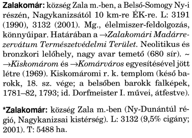Nyilvános 2107 | 5566 | Rövid leírás | Teljes leírás (2.34 KB) | A szócikkek felismertetett szövege: (A csillag után a kiegészítő kötetből származó szöveg következik) Zalakomár: község Zala m.-ben, a Belső-Somogy Ny-i részén, Nagykanizsától 10 km-re ÉK-re. L: 3191 (1990), 3132 (2001). Mg., élelmiszer-feldolgozás, könnyűipar. Határában a → Zalakomári Madárrezervátum Természetvédelmi Terület. Neolitikus és bronzkori lelőhely, nagy avar temető (680 sír). ~ →Kiskomárom és →Komárváros egyesítésével jött létre (1969). Kiskomáromi r. k. templom (késő barokk, 18. sz. vége; a belsőben barokk falképek, 1781-82, 1793; id. Dorfmeister I. művei, átfestve). *Zalakomár: község Zala m.-ben (Ny-Dunántúl régió, Nagykanizsai kistérség). L: 3132 (9,5% cigány; 2001). T: 5488 ha. A szócikkek a következő lexikonból származnak: Cím: Magyar nagylexikon Közreműködő: Élesztős László (1949) (szerk.) ; Barabás Éva (1943) (szerk.) ; Berényi Gábor (1946) (szerk.) ; Bárány Lászlóné (szerk.) ; Adelmann-né Kertész Judit (1945) (közrem.) ; Froemel Károlyné Jáky Éva (1936) (közrem.) ; Akadémiai Kiadó és Nyomda Vállala Szerz. közl.: [... Élesztős László főszerk.] ; [szerk. Barabás Éva et al.] ; [bibliogr. Adelmanné Kertész Judit] ; [kész. az Akadémiai Kiadó Magyar Nagylexikon Szerkesztőségében] Kiadás: Budapest : Akad. K., 1993- Kötetei: 1. köt., A - Anc 2. köt., And - Bag 3. köt., Bah - Bij 4. köt., Bik - Bz 5. köt., C - Csem 6. köt., Csen - Ec 7. köt., Ed - Fe 8. köt., Ff - Gyep 9. köt., Gyer - Iq 10. köt., Ir - Kip 11. köt., Kir - Lem 12. köt., Len - Mep 13. köt., Mer - Nyk 14. köt., Nyl - Pom 15. köt., Pon - Sek 16. köt., Sel - Szö 17. köt., Szp - Ung 18. köt., Unh - Z 19. köt., Kiegészítő kötet, A - Z ETO jelzet: 030=945.11 Szakjelzet: 030 Cutter: M 14 ISBN: 963-05-6611-7 [!ISBN 963-05-6615-X] Nyelv: magyar Megjegyzés: Az 5. kötettől kiad. a Magyar Nagylexikon Kiadó ; A 6. kötettől főszerk. Berényi Gábor ; A 6. kötettől szakszerk. Bárány Lászlóné et al. ; A 6. kötettől bibliogr. Froemel Károlyné ; Bibliogr. a szócikkek végén |