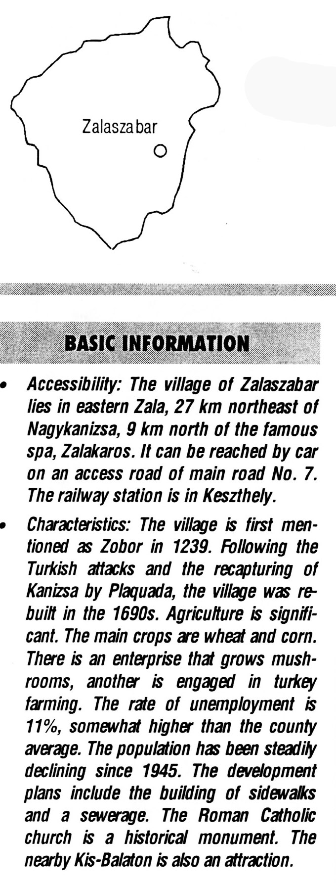 Nyilvános 2269 | 7745 | Zalaszabar | BASIC INFORMATION Accessibility: The village of Zalaszabar lies in eastern Zala, 27 km northeast of Nagykanizsa, 9 km north of the famous spa, Zalakaros. It can be reached by car on an access road of main road No. 7. The railway station is in Keszthely. Characteristics: The village is first mentioned as Zobor in 1239. Following the Turkish attacks and the recapturing of Kanizsa by Plaquada, the village was rebuilt in the 1690s. Agriculture is significant. The main crops are wheat and corn. There is an enterprise that grows mushrooms, another is engaged in turkey farming. The rate of unemployment is 11%, somewhat higher than the county average. The population has been steadily declining since 1945. The development plans include the building of sidewalks and a sewerage. The Roman Catholic church is a historical monument. The nearby Kis-Balaton is also an attraction. This text came from the following book: Title: Handbook of Zala county (Zala megye kézikönyve) Series: County handbooks of Hungary (Magyarország megyei kézikönyvei) Chief editor: Hóbor József Publisher: (Hatvan), CEBA-Hungary Ltd, 1998 ETO: 908.439.121(035) ; 050.8(439.121) ISBN: 963-9089-18-2 Pages: 488-1040 p. Remark: Closed on: 1998. márc. 31. |