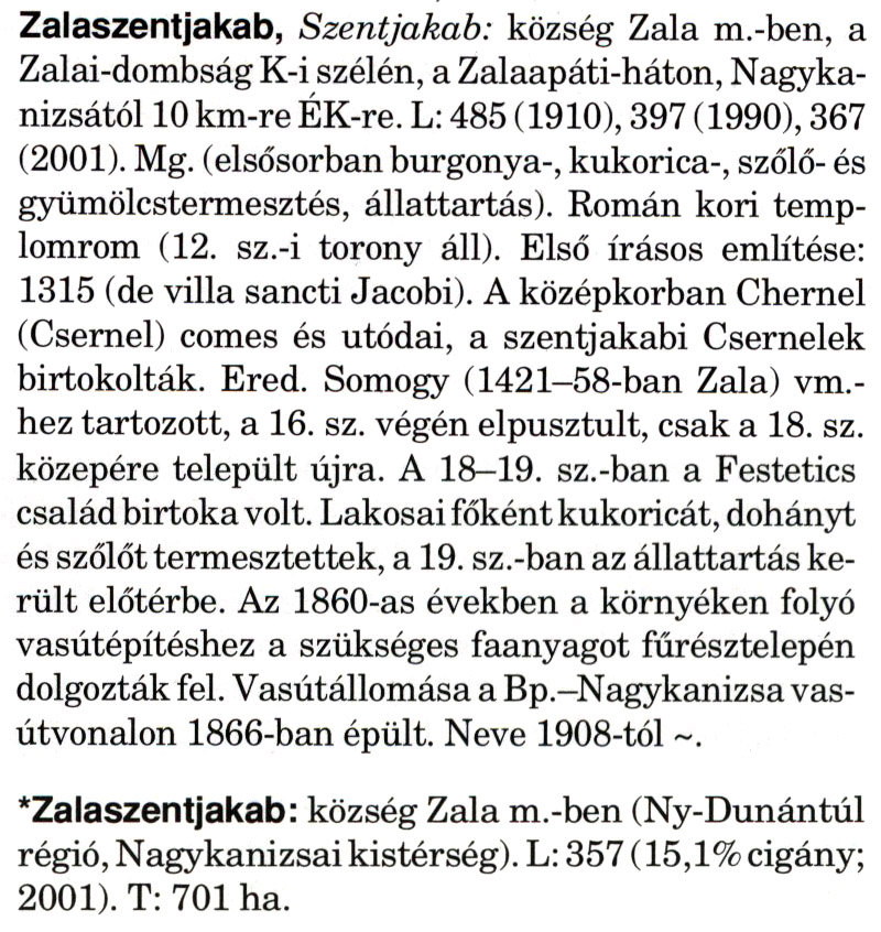 Nyilvános 2046 | 5606 | A szócikkek felismertetett szövege: | (A csillag után a kiegészítő kötetből származó szöveg következik) Zalaszentjakab, Szentjakab: község Zala m.-ben, a Zalai-dombság K-i szélén, a Zalaapáti-háton, Nagykanizsától 10 km-re ÉK-re. L: 485 (1910), 397 (1990), 367 (2001). Mg. (elsősorban burgonya-, kukorica-, szőlő- és gyümölcstermesztés, állattartás). Román kori templomrom (12. sz.-i torony áll). Első írásos említése: 1315 (de villa sancti Jacobi). A középkorban Chernel (Csernel) comes és utódai, a szentjakabi Csernelek birtokolták. Ered. Somogy (1421-58-ban Zala) vm.-hez tartozott, a 16. sz. végén elpusztult, csak a 18. sz. közepére települt újra. A 18—19. sz.-ban a Festetics család birtoka volt. Lakosai főként kukoricát, dohányt és szőlőt termesztettek, a 19. sz.-ban az állattartás került előtérbe. Az 1860-as években a környéken folyó vasútépítéshez a szükséges faanyagot fűrésztelepén dolgozták fel. Vasútállomása a Bp.-Nagykanizsa vasútvonalon 1866-ban épült. Neve 1908-tól ~. *Zalaszentjakab: község Zala m.-ben (Ny-Dunántúl régió, Nagykanizsai kistérség). L: 357 (15,1% cigány; 2001). T: 701 ha. A szócikkek a következő lexikonból származnak: Cím: Magyar nagylexikon Közreműködő: Élesztős László (1949) (szerk.) ; Barabás Éva (1943) (szerk.) ; Berényi Gábor (1946) (szerk.) ; Bárány Lászlóné (szerk.) ; Adelmann-né Kertész Judit (1945) (közrem.) ; Froemel Károlyné Jáky Éva (1936) (közrem.) ; Akadémiai Kiadó és Nyomda Vállala Szerz. közl.: [... Élesztős László főszerk.] ; [szerk. Barabás Éva et al.] ; [bibliogr. Adelmanné Kertész Judit] ; [kész. az Akadémiai Kiadó Magyar Nagylexikon Szerkesztőségében] Kiadás: Budapest : Akad. K., 1993- Kötetei: 1. köt., A - Anc 2. köt., And - Bag 3. köt., Bah - Bij 4. köt., Bik - Bz 5. köt., C - Csem 6. köt., Csen - Ec 7. köt., Ed - Fe 8. köt., Ff - Gyep 9. köt., Gyer - Iq 10. köt., Ir - Kip 11. köt., Kir - Lem 12. köt., Len - Mep 13. köt., Mer - Nyk 14. köt., Nyl - Pom 15. köt., Pon - Sek 16. köt., Sel - Szö 17. köt., Szp - Ung 18. köt., Unh - Z 19. köt., Kiegészítő kötet, A - Z ETO jelzet: 030=945.11 Szakjelzet: 030 Cutter: M 14 ISBN: 963-05-6611-7 [!ISBN 963-05-6615-X] Nyelv: magyar Megjegyzés: Az 5. kötettől kiad. a Magyar Nagylexikon Kiadó ; A 6. kötettől főszerk. Berényi Gábor ; A 6. kötettől szakszerk. Bárány Lászlóné et al. ; A 6. kötettől bibliogr. Froemel Károlyné ; Bibliogr. a szócikkek végén |
