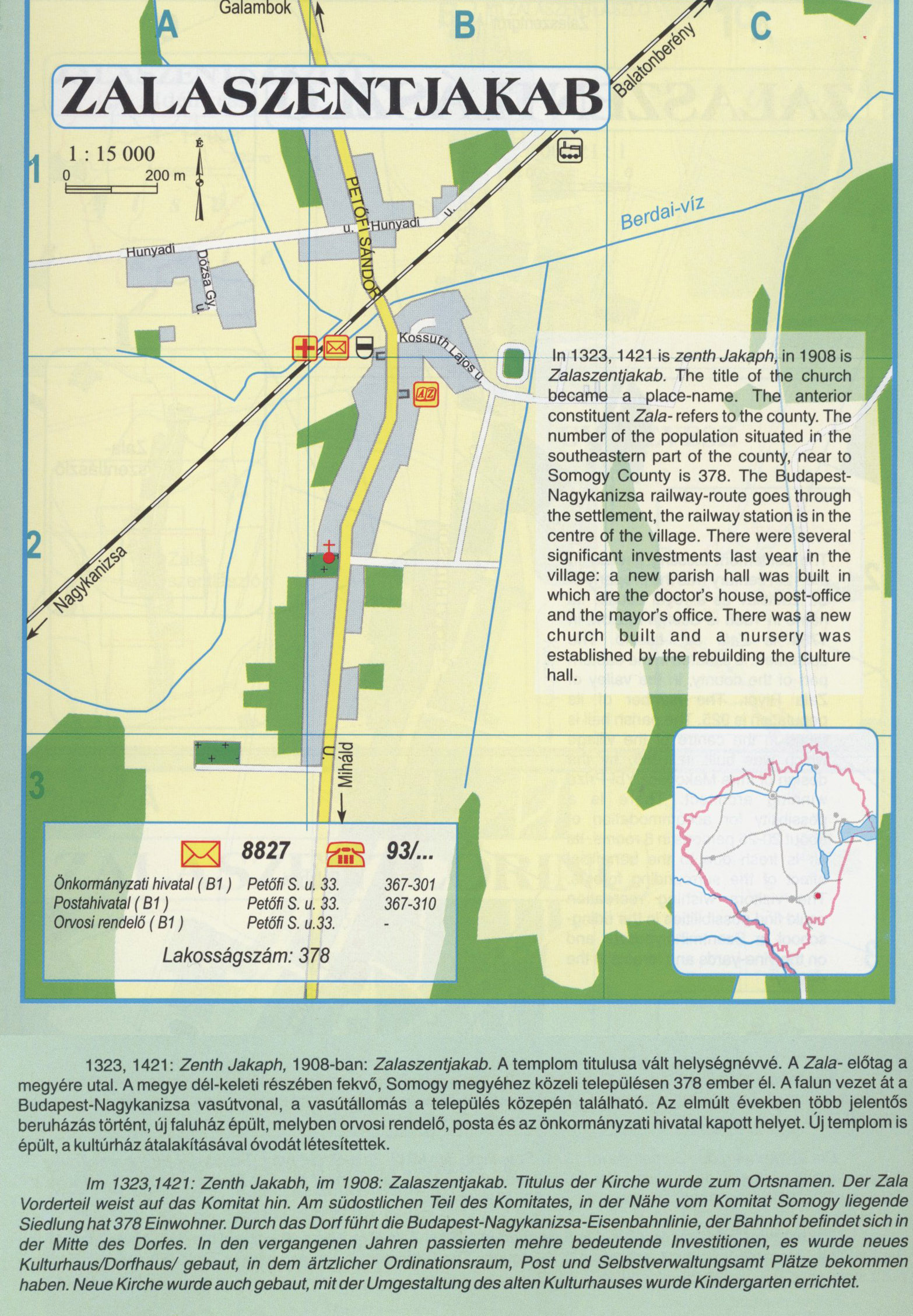Nyilvános 2100 | 6918 | ZALASZENTJAKAB | 1323, 1421: Zenth Jakaph, 1908-ban: Zalaszentjakab. A templom titulusa vált helységnévvé. A Zala- előtag a megyére utal. A megye dél-keleti részében fekvő, Somogy megyéhez közeli településen 378 ember él. A falun vezet át a Budapest-Nagykanizsa vasútvonal, a vasútállomás a település közepén található. Az elmúlt években több jelentős beruházás történt, új faluház épült, melyben orvosi rendelő, posta és az önkormányzati hivatal kapott helyet. Új templom is épült, a kultúrház átalakításával óvodát létesítettek. lm 1323,1421: Zenth Jakabh, im 1908: Zalaszentjakab. Titulus der Kirche wurde zum Ortsnamen. Der Zala Vorderteil weist auf das Komitat hin. Am südostlichen Teil des Komitates, in der Nähe vom Komitat Somogy liegende Siedlung hat 378 Einwohner. Durch das Dorf führt die Budapest-Nagykanizsa-Eisenbahnlinie, der Bahnhof befindet sich in der Mitte des Dorfes. In den vergangenen Jahren passierten mehre bedeutende Investitionen, es wurde neues Kulturhaus/Dorfhaus/ gebaut, in dem ärtzlicher Ordinationsraum, Post und Selbstverwaltungsamt Plätze bekommen haben. Neue Kirche wurde auch gebaut, mit der Umgestaltung des alten Kulturhauses wurde Kindergarten errichtet. In 1323,1421 is zenth Jakaph, in 1908 is Zalaszentjakab. The title of the church became a place-name. The anterior constituent Zala- refers to the county. The number of the population situated in the southeastern part of the county, near to Somogy County is 378. The Budapest-Nagykanizsa railway-route goes through the settlement, the railway station is in the centre of the village. There were several significant investments last year in the village: a new parish hall was built in which are the doctor\'s house, post-office and the mayor\'s office. There was a new church built and a nursery was established by the rebuilding the culture hall. A részlet a következő kiadványból származik/Die Teile stammen vom volgenden Buch/This text came from the following book: Cím/Titel/Title: Zala megye településeinek atlasza - 257 település részletes térképe/Atlas der Komitat Zala - 257 Detailte Siedlungskarten/Zala county\'s Atlas - 257 settlement maps. Közreműködő/contributor: Lackner László (1943) (fotó) Kiadás/Ausgabe/Publisher: Gyula : HISZI-MAP, 1997 Sorozat/Serie/Series: Indulástól - megérkezésig... ETO: 912(439.121-2) ; 908.439.121 Cutter: Z 19 ISBN: 963-610-025-4 Oldalszám/Seiten/Pages: 323, 81 p. Megjegyzés/Note: Lezárva/Abgeschlossen am/Closed am: 1997. máj. 30. |