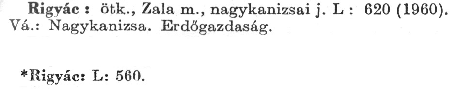 Nyilvános 2121 | 5777 | A szócikkek felismertetett szövege: | (Az első csillag után az 1972-es, a második csillag után az 1981-es kiadású kiegészítő kötetből származó szöveg következik) Rigyác: ötk., Zala m., nagykanizsai j. L: 620(1960). Vá.: Nagykanizsa. Erdőgazdaság. *Rigyác: L: 560. A szócikkek a következő lexikonból származnak: Cím: Új magyar lexikon Közreműködő: Berei Andor (1900-1979) (szerk.) Szerz. közl.: [szerk. Berei Andor et al.] Kiadás jelzés: 2. lny. Kiadás: Budapest : Akad. K., 1961-1962 Kötetei: 1., A - C 2., D - F 3., G - J 4., K - Me 5., Mf - R 6., S - Z 7. köt., A-Z Kiegészítő kötet (1972) Kiegészítő kötet, 1962÷1980 (1981) ETO jelzet: 03=945.11 Szakjelzet: 030 Cutter: U 28 Nyelv: magyar Megjegyzés: Bibliogr. a címszavak egy részének végén |