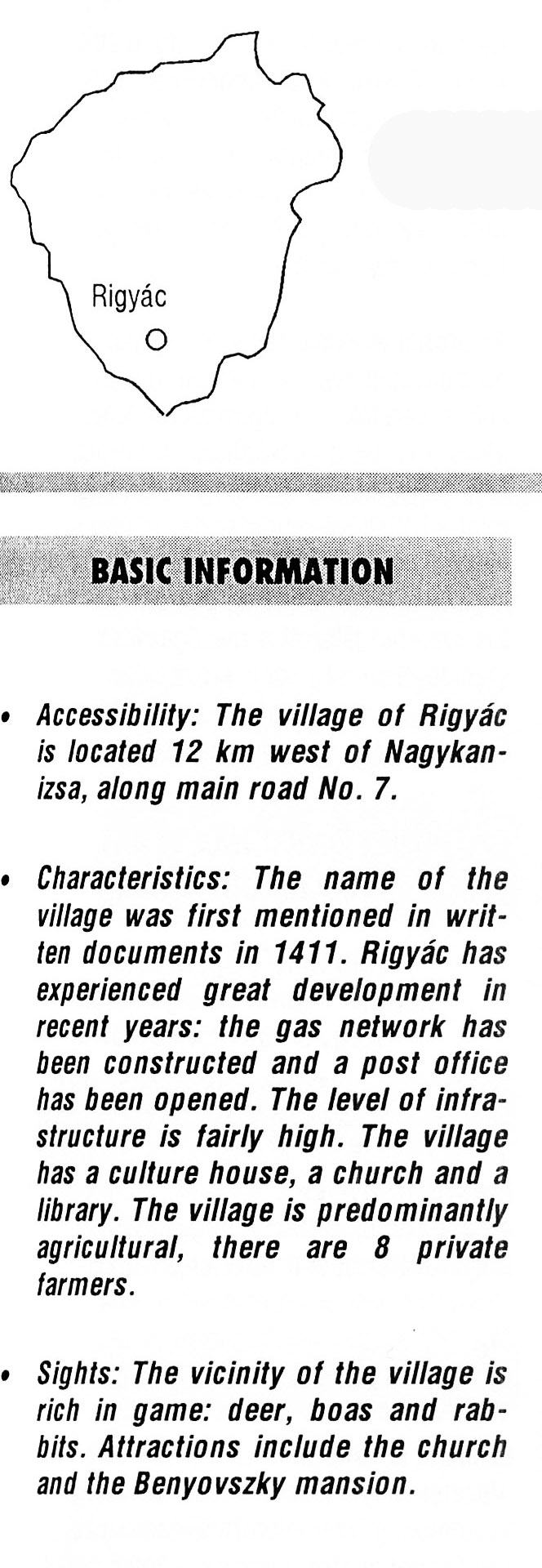 Nyilvános 2159 | 5742 | Rigyác | BASIC INFORMATION Accessibility. The village of Rigyác is located 12 km west of Nagykanizsa, along main road No. 7. Characteristics: The name of the village was first mentioned in written documents in 1411. Rigyác has experienced great development in recent years: the gas network has been constructed and a post office has been opened. The level of infrastructure is fairly high. The village has a culture house, a church and a library. The village is predominantly agricultural, there are 8 private farmers. Sights: The vicinity of the village is rich in game: deer, boas and rabbits. Attractions include the church and the Benyovszky mansion. This text came from the following book: Title: Handbook of Zala county (Zala megye kézikönyve) Series: County handbooks of Hungary (Magyarország megyei kézikönyvei) Chief editor: Hóbor József Publisher: (Hatvan), CEBA-Hungary Ltd, 1998 ETO: 908.439.121(035) ; 050.8(439.121) ISBN: 963-9089-18-2 Pages: 488-1040 p. Remark: Closed on: 1998. márc. 31. |