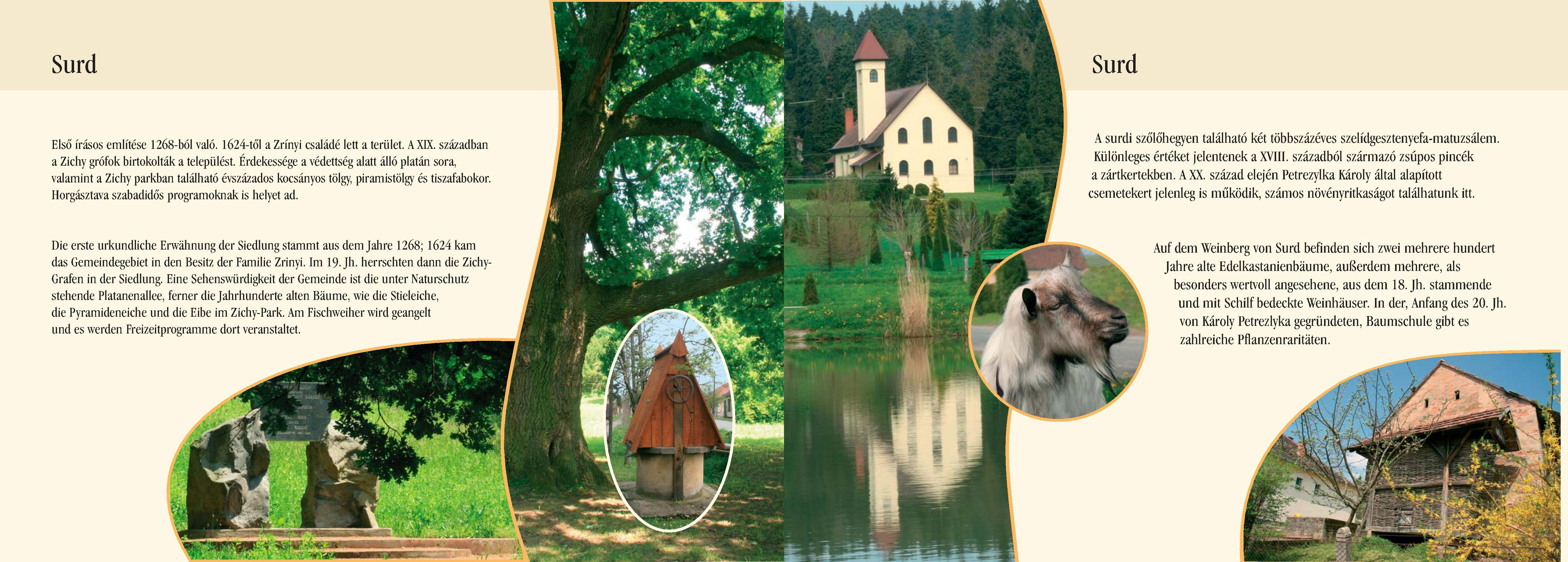 Nyilvános 2666 | 8686 | Surd | Die erste urkundliche Erwähnung der Siedlung stammt aus dem Jahre 1268; 1624 kam das Gemeindegebiet in den Besitz der Familie Zrinyi. Im 19. Jh. herrschten dann die Zichy-Grafen in der Siedlung. Eine Sehenswürdigkeit der Gemeinde ist die unter Naturschutz stehende Platanenallee, ferner die Jahrhunderte alten Bäume, wie die Stieleiche, die Pyramideneiche und die Eibe im Zichy-Park. Am Fischweiher wird geangelt und es werden Freizeitprogramme dort veranstaltet. Auf dem Weinberg von Surd befinden sich zwei mehrere hundert Jahre alte Edelkastanienbäume, außerdem mehrere, als besonders wertvoll angesehene, aus dem 18. Jh. stammende und mit Schilf bedeckte Weinhäuser. In der, Anfang des 20. Jh. von Károly Petrezlyka gegründeten, Baumschule gibt es zahlreiche Pflanzenraritäten. Dieses Text stammt von: Pannonhát tájpark prospektus 2006. Web: http://www.pannonhat.hu/ (auch in Deutsch |