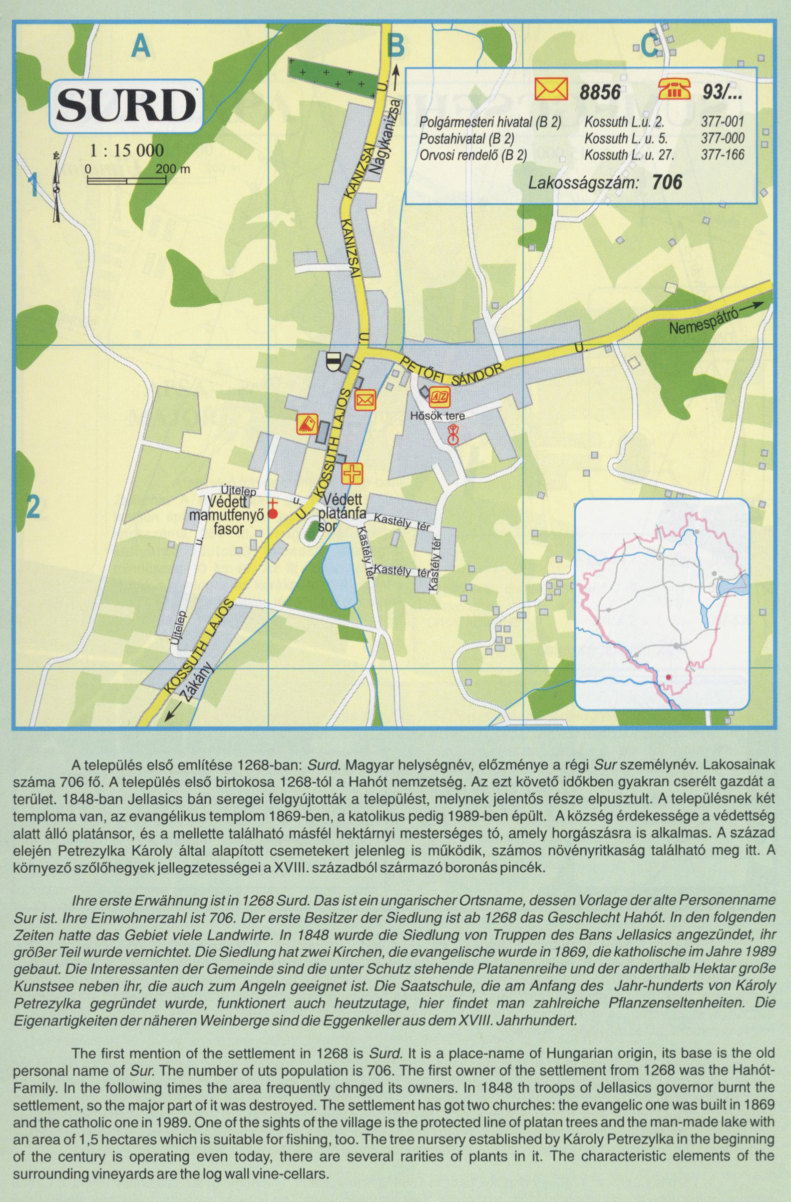 Nyilvános 2459 | 9632 | SURD | A település első említése 1268-ban: Surd. Magyar helységnév, előzménye a régi Sur személynév. Lakosainak száma 706 fő. A település első birtokosa 1268-tól a Hahót nemzetség. Az ezt követő időkben gyakran cserélt gazdát a terület. 1848-ban Jellasics bán seregei felgyújtották a települést, melynek jelentős része elpusztult. A településnek két temploma van, az evangélikus templom 1869-ben, a katolikus pedig 1989-ben épült. A község érdekessége a védettség alatt álló platánsor, és a mellette található másfél hektárnyi mesterséges tó, amely horgászásra is alkalmas. A század elején Petrezylka Károly által alapított csemetekert jelenleg is működik, számos növényritkaság található meg itt. A környező szőlőhegyek jellegzetességei a XVIII. századból származó boronás pincék. Ihre erste Erwähnung ist in 1268 Surd. Das ist ein ungarischer Ortsname, dessen Vorlage der alte Personenname Sur ist. Ihre Einwohnerzahl ist 706. Der erste Besitzer der Siedlung ist ab 1268 das Geschlecht Hahót. In den folgenden Zeiten hatte das Gebiet viele Landwirte. In 1848 wurde die Siedlung von Truppen des Bans Jellasics angezündet, ihr größer Teil wurde vernichtet. Die Siedlung hat zwei Kirchen, die evangelische wurde in 1869, die katholische im Jahre 1989 gebaut. Die Interessanten der Gemeinde sind die unter Schutz stehende Platanenreihe und der anderthalb Hektar große Kunstsee neben ihr, die auch zum Angeln geeignet ist. Die Saatschule, die am Anfang des Jahr-hunderts von Károly Petrezylka gegründet wurde, funktionert auch heutzutage, hier findet man zahlreiche Pflanzenseltenheiten. Die Eigenartigkeiten der näheren Weinberge sind die Eggenkeller aus dem XVIII. Jahrhundert. The first mention of the settlement in 1268 is Surd. It is a place-name of Hungarian origin, its base is the old personal name of Sur. The number of uts population is 706. The first owner of the settlement from 1268 was the Hahót-Family. In the following times the area frequently chnged its owners. In 1848 th troops of Jellasics governor burnt the settlement, so the major part of it was destroyed. The settlement has got two churches: the evangelic one was built in 1869 and the catholic one in 1989. One of the sights of the village is the protected line of platan trees and the man-made lake with an area of 1,5 hectares which is suitable forfishing, too. The tree nursery established by Károly Petrezylka in the beginning of the century is operating even today, there are several rarities of plants in it. The characteristic elements of the surrounding vineyards are the log wall vine-cellars. A részlet a következő kiadványból származik/Die Teile stammen vom volgenden Buch/This text came from the following book: Cím/Titel/Title: Zala megye településeinek atlasza - 257 település részletes térképe/Atlas der Komitat Zala - 257 Detailte Siedlungskarten/Zala county\'s Atlas - 257 settlement maps. Közreműködő/contributor: Lackner László (1943) (fotó) Kiadás/Ausgabe/Publisher: Gyula : HISZI-MAP, 1997 Sorozat/Serie/Series: Indulástól - megérkezésig... ETO: 912(439.121-2) ; 908.439.121 Cutter: Z 19 ISBN: 963-610-025-4 Oldalszám/Seiten/Pages: 323, 81 p. Megjegyzés/Note: Lezárva/Abgeschlossen am/Closed am: 1997. máj. 30. |