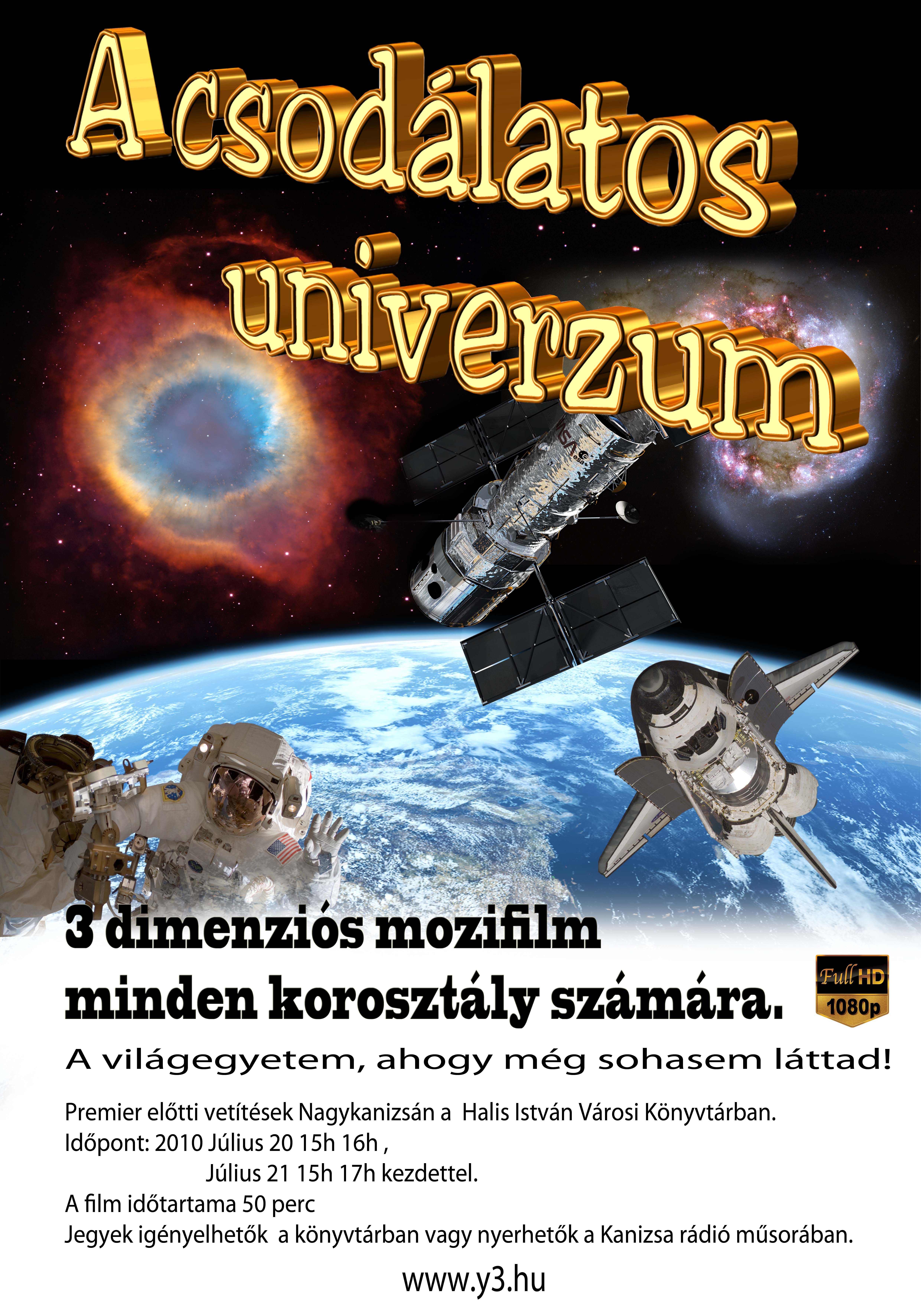 Nyilvános 1461 | 3883 | A csodálatos univerzum | 3 dimenziós mozifilm minden korosztály számára. A világegyetem, ahogy még sohasem láttad! Premier előtti 3D vetítések Nagykanizsán a Halis István Városi Könyvtárban. Időpont: 2010. július 20. 15h 16h, július 21. 15h 17h kezdettel. A film időtartama 50 perc. Jegyek igényelhetők a könyvtárban vagy nyerhetők a Kanizsa rádió műsorában. www.y3.hu Full HD 1080p |
