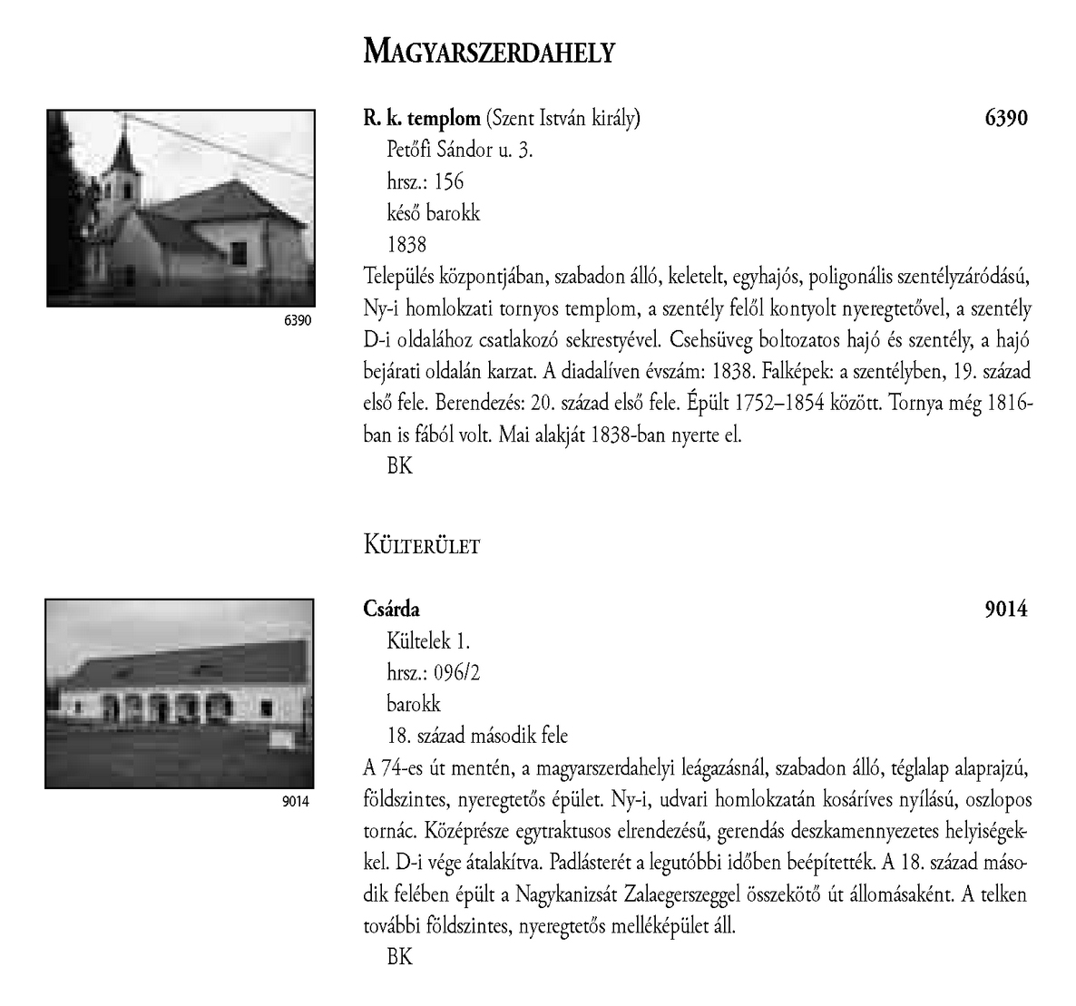 Nyilvános 2332 | 7036 | Magyarszerdahely - Magyarország műemlékjegyzéke - Zala megye 2006 068-069old | A részlet szövege: MAGYARSZERDAHELY R. k. templom (Szent István király) 6390 Petőfi Sándor u. 3. hrsz.: 156 késő barokk 1838 Település központjában, szabadon álló, keletelt, egyhajós, poligonális szentélyzáródású, Ny-i homlokzati tornyos templom, a szentély felől kontyolt nyeregtetővel, a szentély D-i oldalához csatlakozó sekrestyével. Csehsüveg boltozatos hajó és szentély, a hajó bejárati oldalán karzat. A diadalíven évszám: 1838. Falképek: a szentélyben, 19. század első fele. Berendezés: 20. század első fele. Épült 1752–1854 között. Tornya még 1816ban is fából volt. Mai alakját 1838-ban nyerte el. BK KÜLTERÜLET Csárda Kültelek 1. hrsz.: 096/2 barokk 18. század második fele 9014 A 74-es út mentén, a magyarszerdahelyi leágazásnál, szabadon álló, téglalap alaprajzú, földszintes, nyeregtetős épület. Ny-i, udvari homlokzatán kosáríves nyílású, oszlopos tornác. Középrésze egytraktusos elrendezésű, gerendás deszkamennyezetes helyiségekkel. D-i vége átalakítva. Padlásterét a legutóbbi időben beépítették. A 18. század második felében épült a Nagykanizsát Zalaegerszeggel összekötő út állomásaként. A telken további földszintes, nyeregtetős melléképület áll. BK A részlet a következő könyv online változatából származik: Cím: Magyarország műemlékjegyzéke Közreműködő: Haris Andrea. (szerk.) ; Kulturális Örökségvédelmi Hivatal (Budapest) (közread.) ; Somorjay Sélysette. (szerk.) ; Bardoly István (közrem.) Szerz. közl.: [sorozatszerk. Haris Andrea, Somorjay Sélysette] ; [mtárs Bardoly István] ; [közread. a] Kulturális Örökségvédelmi Hivatal. Kiadás: Budapest : KÖH, 2006 Kötetadat: Zala megye ISBN: 963-86510-7-5 ö ISBN: 963 7474 10 2 Nyelv: magyar A jegyzék a Kultúrális Örökségvédelmi Hivatal honlapján, a következő link alatt található: http://www.koh.hu/index.php?_mp=nyitolap&_amp=MUEML A fejléc adatairól 1. Objektum neve – törzsszám A fejléc első sora a műemlék eredeti rendeltetésének megfelelő nevet tartalmazza. Mögötte zárójelben templom esetében annak titulusa, más épületeknél indokolt esetben az eredeti rendeltetéstől eltérő, mai használatra utaló intézmény név (pl. városháza, múzeum, szálloda, oktatási intézmény hivatalos neve, stb.) olvasható. A törzsszám (trsz.) a műemlék egyetlen soha nem változó adata. A gyors azonosítás, illetve a törzsszám szerinti keresés lehetősége végett az objektummal egy sorban, a fejléc jobb szélén kiemelten jelenik meg. Összetartozó műemlék részek vagy történetileg egy együttest alkotó műemlékek sokszor külön törzsszámon lettek műemlékké nyilvánítva. Előfordulhat ezért, hogy egy fejléc alatt a leíró részben több, külön törzsszámmal rendelkező objektum szerepel. A törzsszámot ezekben az esetekben is az objektummal egy sorban tüntetjük fel. 2. Utca, házszám Egy utcán belül, amennyiben a számozás ezt lehetővé teszi, először a templomot adjuk meg, ezt követi a parókia, majd egyéb objektumok, pl. szobrok következnek. Házszám nélkül említünk egyes műemlékfajtákat (elsősorban templomokat), amennyiben a topográfiai azonosítás szempontjából a házszám közömbös vagy éppen zavaró. Előfordul, hogy a műemlék nem köthető nevesített közterülethez. Az ilyeneket a település végéhez soroltuk, és a leírásban kitértünk a településen belül elfoglalt helyükre. 3. Helyrajzi szám Ha egy helyrajzi számon és egy címen (pl. temetőben) több, külön törzsszámmal védett objektum van, akkor az együttesre utaló műemlék megnevezés alatt a közös adatokat egyszer adjuk meg. Ezt követően külön címszavanként következik a műemlékek leírása. Ilyen esetben az emlékeket mutatóztuk. Ezt az eljárást követtük, tekintet nélkül arra, hogy a teljes együttes védett-e vagy sem. (Védett együttes mellett mindig törzsszám szerepel.) Ha több helyrajzi szám is tartozik egy törzsszámhoz, akkor a fejlécben valamennyi számot feltüntettük. Amennyiben ilyen esetben több elemből álló műemlékről van szó, akkor a leíró részben minden külön említett elem után zárójelben megadjuk a vonatkozó helyrajzi számot. 4. Stílus A műemléket jelenleg meghatározó, domináns stílusjegy alapján került meghatározásra. Egyéb, érzékelhető stíluselemekre a leíró részben utalunk. 5. Datálás A műemléket jelenleg leginkább jellemző építési dátum. Korábbi építési periódusokra, illetve későbbi átépítésekre a történeti részben utalunk, fennmaradt részletek esetén lehetőség szerint azokra vonatkoztatva. A leírás A műemlékek leírása tartalmilag öt szakaszból áll, amely folyamatos szövegként jelenik meg. Az objektum topográfiai meghatározása a műemlék településen belüli vagy ahhoz viszonyított helyét adja meg, amennyiben ez az azonosításhoz nélkülözhetetlen, avagy azt segíti. Az emlék jellegének leírása utal a környezettel való kapcsolatra (tájolás, beépítés módja, környező terepviszonyok, amennyiben ezek jellemzőek), alaprajzi elrendezésre, tömegre és a jellegzetes homlokzati elemekre (pl. rizalitok, erkélyek, stb.). Részletes homlokzatleírás nem volt cél. Belső építészeti részletet csak akkor említünk meg, ha ez tartozékként jelentős, esetleg a datálás vagy a stílus meghatározás alapjául szolgált. Ezt követi az épület tartozékainak és berendezésének utalásszerű ismertetése (falfestés, üvegablak, berendezés), az adott elem után zárójelben az ismert mesterek nevével; az orgonát külön említjük, amennyiben hangszerként is műemléki értékkel bír. A mesternevekre, berendezésre történő utalás jelzésszerű, tételes információért 