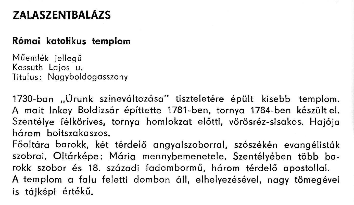 Nyilvános 1907 | 3585 | Zalaszentbalázs - Zala megye műemlékei 1979 122old | A részlet szövege: ZALASZENTBALÁZS Római katolikus templom Műemlék jellegű Kossuth Lajos u. Titulus: Nagyboldogasszony 1730-ban „Urunk színeváltozása" tiszteletére épült kisebb templom. A mait Inkey Boldizsár építtette 1781-ben, tornya 1784-ben készült el. Szentélye félköríves, tornya homlokzat előtti, vörösréz-sisakos. Hajója három boltszakaszos. Főoltára barokk, két térdelő angyalszoborral, szószékén evangélisták szobrai. Oltárképe: Mária mennybemenetele. Szentélyében több barokk szobor és 18. századi fadombormű, három térdelő apostollal. A templom a falu feletti dombon áll, elhelyezésével, nagy tömegével is tájképi értékű. A részlet a következő könyvből származik: Cím: Zala megye műemlékei Szerző: Németh József (1928) Közreműködő: Vándor László (szerk.) ; Szabóky Zsolt (1941) (fotó) Szerz. közl.: Németh József ; [szerk. Vándor László] ; [fotók... Szabóky Zsolt] Kiadás jelzés: 2. bőv. kiad. Kiadás: Zalaegerszeg : Zalai Ny., 1979 ETO jelzet: 72(439.121) ; 7.025.3/.4(439.121) ; 908.439.121 Tárgyszó: Zala Szakjelzet: 908 Cutter: N 53 Nyelv: magyar Oldalszám: 134 p. |