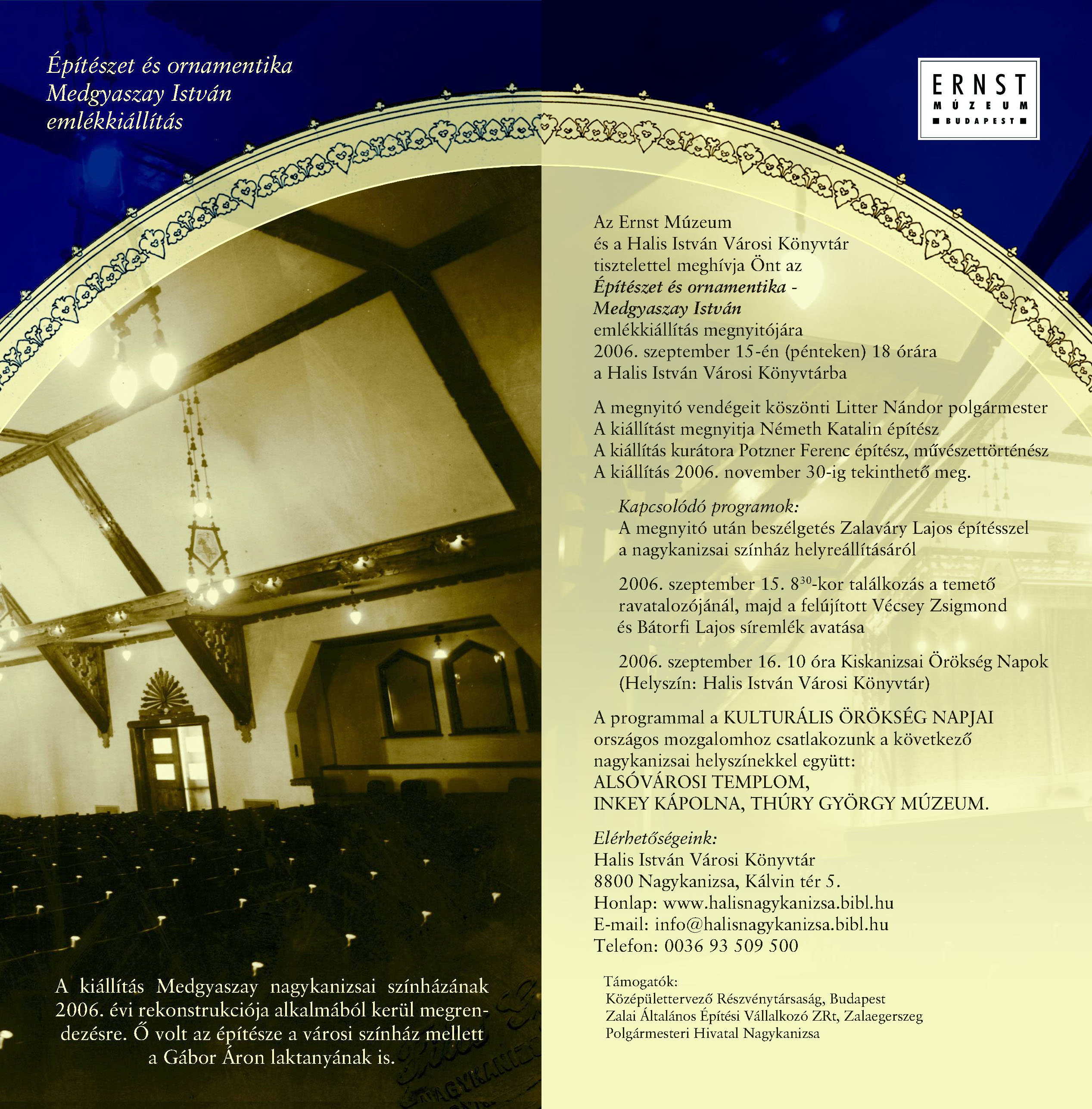 Nyilvános 2608 | 7063 | 2006 09 15 - Építészet és ornamentika - Medgyaszay István emlékkiállítás meghívó | A kiállítás megnyitója az eseménynaptárban is szerepel, a következő link alatt: http://www.nagykar.hu/esemenynaptar/1/488.html A program a Kultúrális Örökség Napjai programsorozat része. Kapcsolódó programok: Helytörténeti konferencia http://www.nagykar.hu/esemenynaptar/1/483.html a felújított Vécsey Zsigmond és Bátorfi Lajos síremlékek avatása http://www.nagykar.hu/esemenynaptar/1/489.html Az meghívó szövege: Építészet és ornamentika - Medgyaszay István emlékkiállítás A kiállítás Medgyaszay nagykanizsai színházának 2006. évi rekonstrukciója alkalmából kerül megrendezésre. Ő volt az építésze a városi színház mellett a Gábor Áron laktanyának is. Az Ernst Múzeum és a Halis István Városi Könyvtár tisztelettel meghívja Önt az Építészet és ornamentika- Medgyaszay István emlékkiállítás megnyitójára 2006. szeptember 15-én (pénteken) 18 órára a Halis István Városi Könyvtárba A megnyitó vendégeit köszönti Litter Nándor polgármester A kiállítást megnyitja Németh Katalin építész A kiállítás kurátora Potzner Ferenc építész, művészettörténész A kiállítás 2006. november 30-ig tekinthető meg. Kapcsolódó programok: A megnyitó után beszélgetés Zalaváry Lajos építésszel a nagykanizsai színház helyreállításáról 2006. szeptember 15. 830-kor találkozás a temető ravatalozójánál, majd a felújított Vécsey Zsigmond és Bátorfi Lajos síremlék avatása 2006. szeptember 16. 10 óra Kiskanizsai Örökség Napok (Helyszín: Halis István Városi Könyvtár) A programmal a KULTURÁLIS ÖRÖKSÉG NAPJAI országos mozgalomhoz csatlakozunk a következő nagykanizsai helyszínekkel együtt: ALSÓVÁROSI TEMPLOM, INKEY KÁPOLNA, THÚRY GYÖRGY MÚZEUM. Elérhetőségeink: Halis István Városi Könyvtár 8800 Nagykanizsa, Kálvin tér 5. Honlap: www.halisnagykanizsa.bibl.hu E-mail: info@halisnagykanizsa.bibl.hu Telefon: 0036 93 509 500 Támogatók: Középülettervező Részvénytársaság, Budapest Zalai Általános Építési Vállalkozó ZRt, Zalaegerszeg Polgármesteri Hivatal Nagykanizsa |