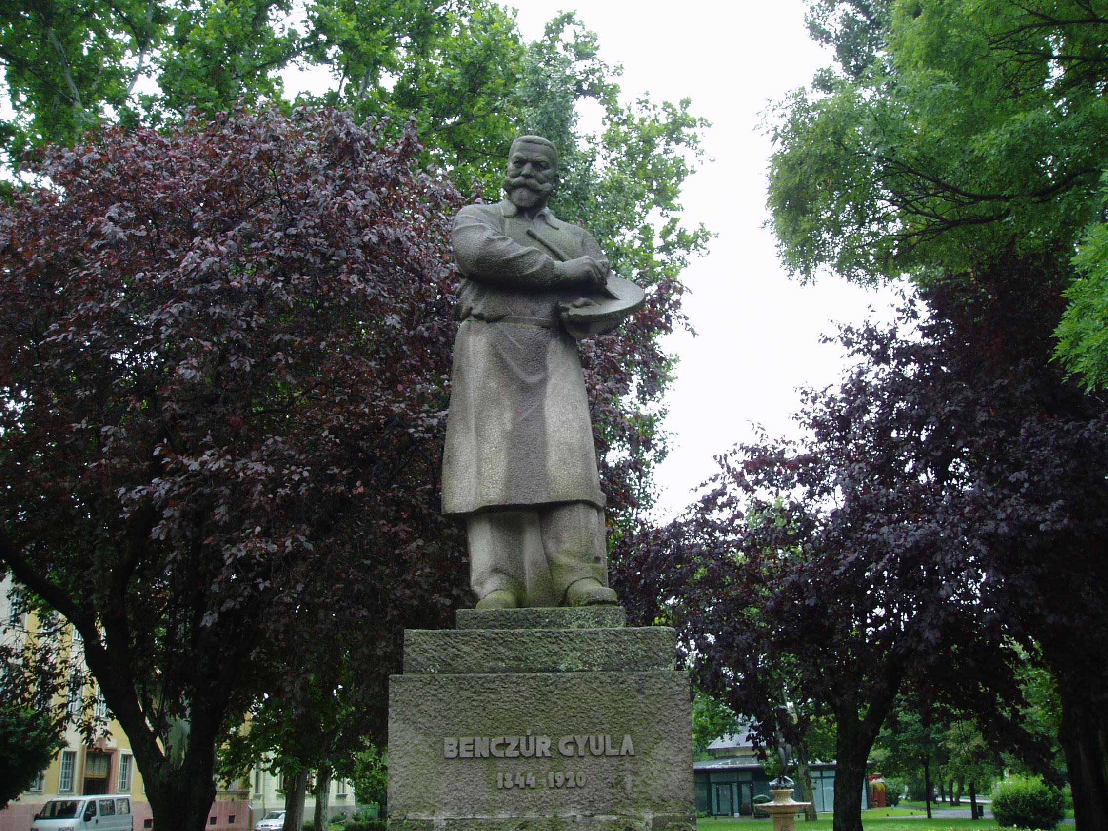 Nyilvános 1164 | 2429 | Nyíregyháza, Benczúr tér: Benczúr Gyula szobra | A nyíregyházi születésű (lásd: Nyíregyháza, Kossuth tér 8.) nagy magyar festőművész egyetlen mészkőtömbből kifaragott szobrát Galántai Fekete Géza készítette 1941-ben. Benczúr Gyula emlékszobája a téren álló Jósa András Múzeumban (lásd: Nyíregyháza, Benczúr tér 21.) tekinthető meg. Felh. irod.: Látnivalók Szabolcs-Szatmár-Bereg megyében. Miskolc, Well-PRess, 1999 A fénykép 2010 augusztus elején készült. |