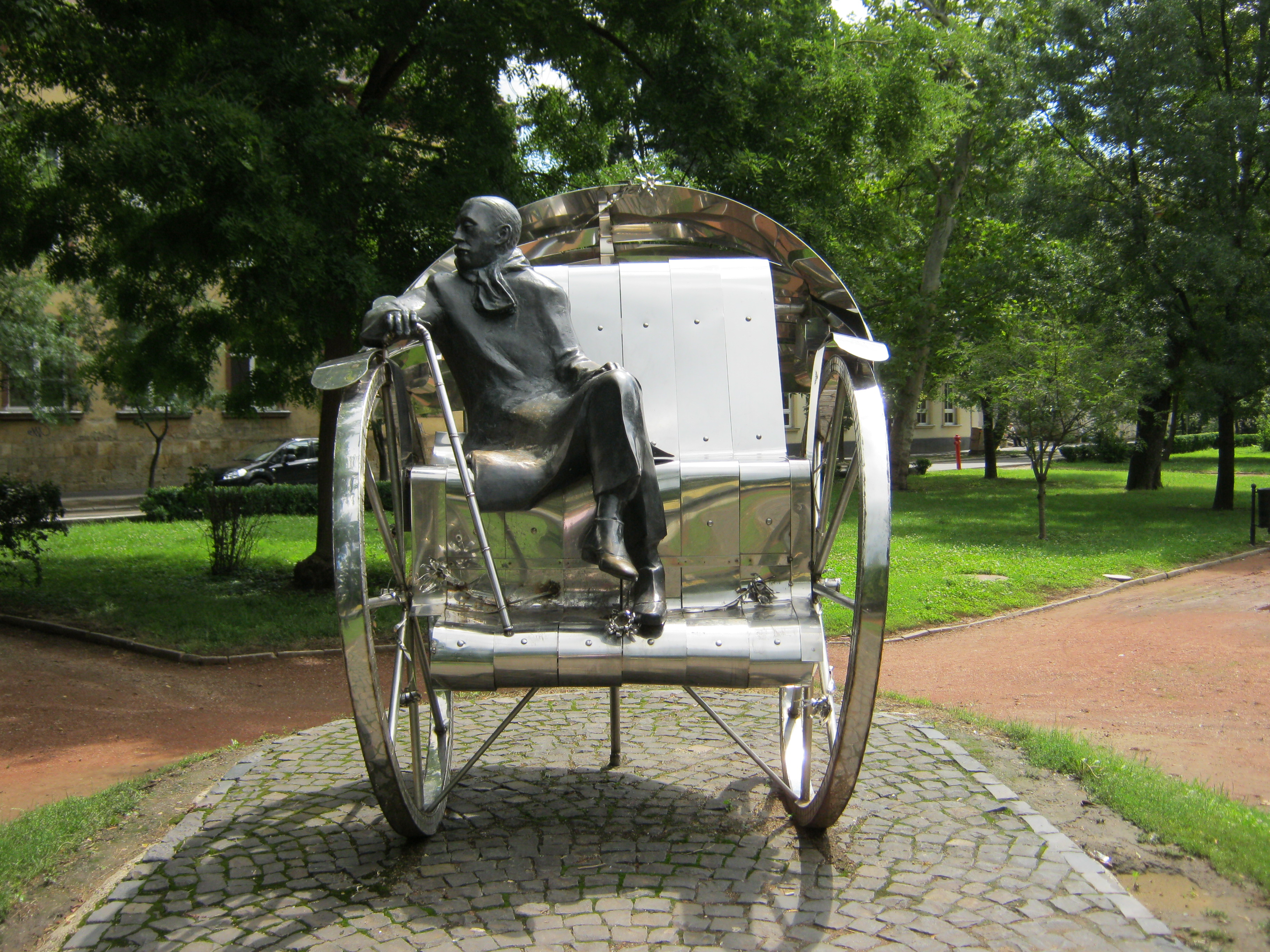Nyilvános 1155 | 3308 | Nyíregyháza, Bessenyei tér: Krúdy Gyula szobra | A Bessenyei téren 2003-ban avatták fel Varga Imre "Hazatérés" című, Krúdy Gyulának emléket állító szoborkompozícióját. Az alkotást Krúdy: A vörös postakocsi című regénye ihlette. Krúdy Nyíregyházán született (lásd: Nyíregyháza, Szent István utca 8.) és itt végezte a gimnázium (lásd: Nyíregyháza, Szent István u. 17-19.) felsőbb osztályait. A fénykép 2010 augusztus elején készült. |