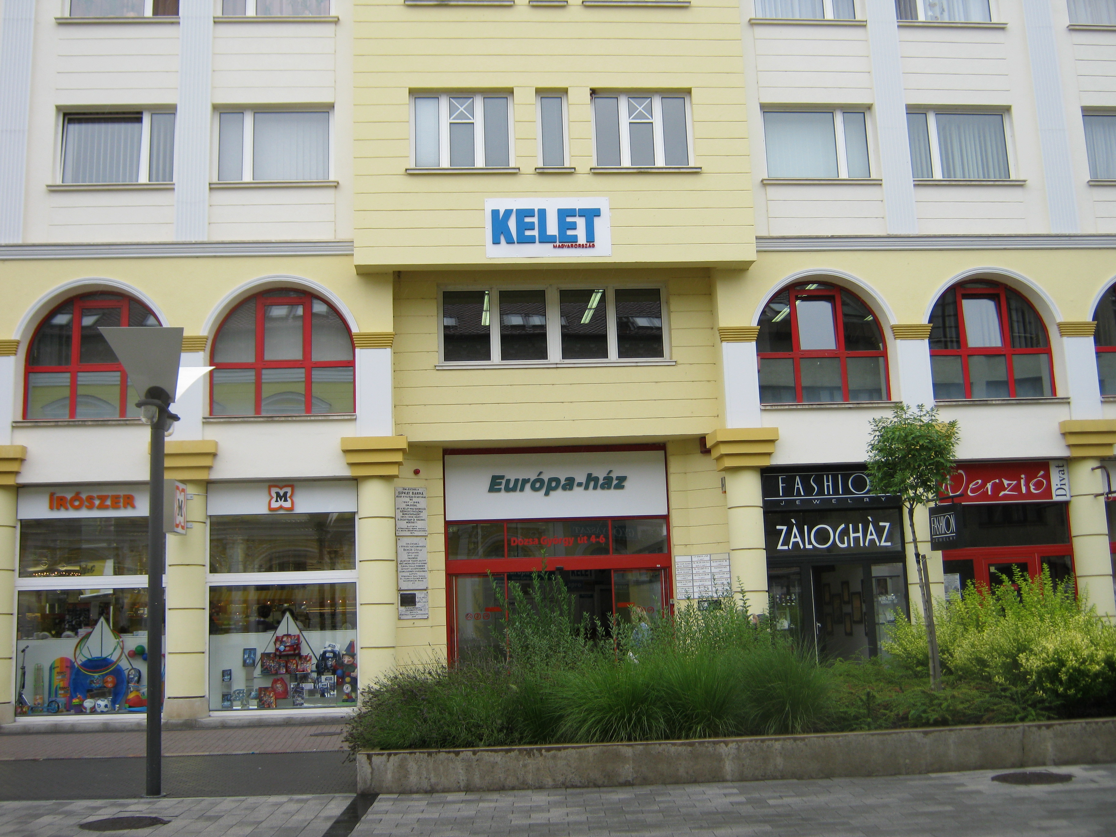 Nyilvános 1139 | 1633 | Nyíregyháza, Dózsa György utca 4-6. Európa-ház | Ezen a helyen z 1880-as évektől a város harmadik legjelentősebb szállodája működött. Itt is muzsikált Nyíregyháza jeles prímása, Benczi Gyula. Krúdy szerint itt zajlottak a leghevesebb kártyacsaták. A szálló a tiszaeszlári per idején a védő, Eötvös Károly munkatársainak főhadiszállása volt. Az első világháború idején zárt be, mert nem bírta a versenyt a Koronával (lásd: Nyíregyháza, Dózsa Gy. u. 1.). Működött benne újságszerkesztőség, majd öregek otthona. A ma helyén álló épületen egy emléktábla az egykori szálló képét is idézi. Felh. irod.: Látnivalók Szabolcs-Szatmár-Bereg megyében. Miskolc, Well-PRess, 1999 Margócsy József: Utcák, terek, emléktáblák [1.] Nyíregyháza, Városi Tanács – Bp., Közgazd. és Jogi Kiadó, 1984 A fénykép 2010 augusztus elején készült. |