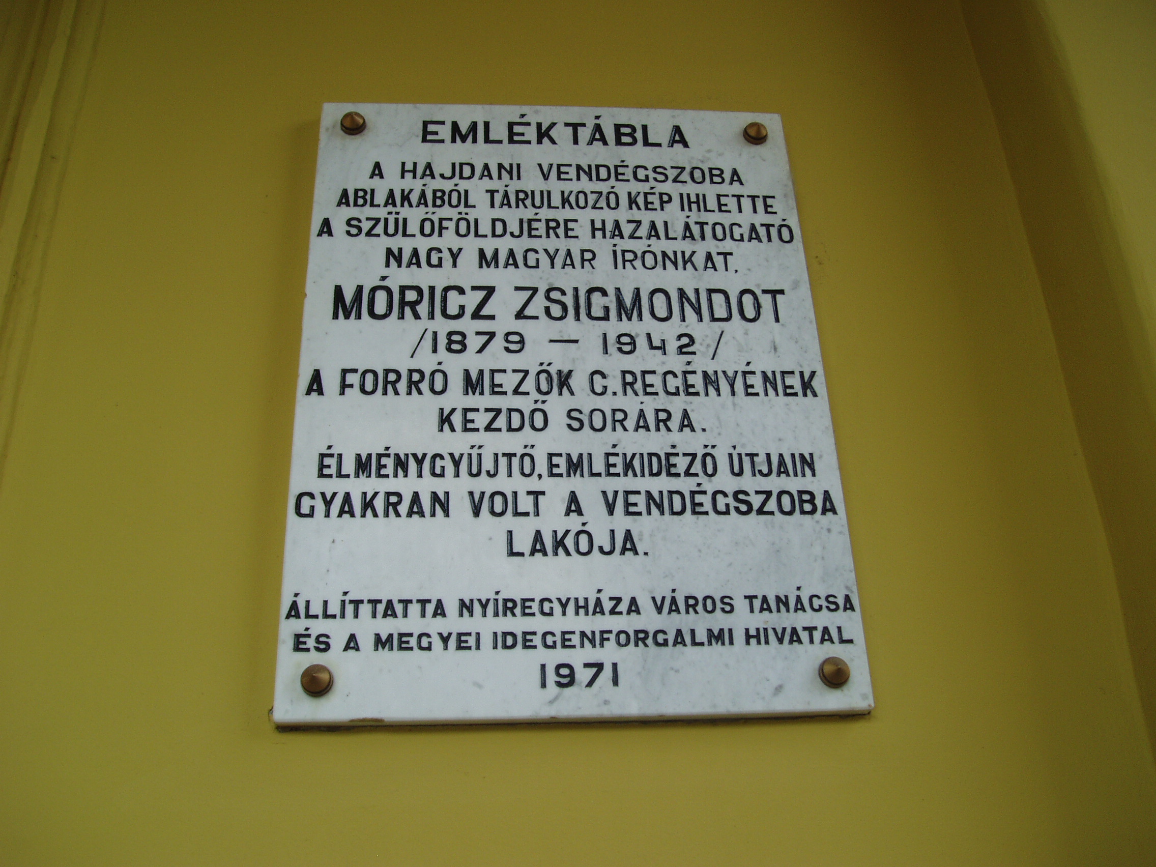 Nyilvános 1113 | 1549 | Nyíregyháza, Kossuth tér 1. Városháza | Nyíregyháza központi terének nyugati oldalát foglalja el a mai alakjában 1872-re felépült Városháza. Az eklektikus stílusú, reneszánsz hangulatú, árkádos bejáratú épületet Benkó Károly tervezte. Az épületen több emléktábla is tanúskodik a város és a városháza múltjáról. Gyakran megfordult a szállodában Móricz Zsigmond. Emléktáblája szerint a hajdani vendégszoba ablakából elébe táruló kép ihlette Forró mezők című regényének kezdetét: "Perzselt a meleg. Még alkonyatkor is. Semmi levegő. A piac olyan volt, mint egy sivatag, a gömbakácok levelei össze voltak zsugorodva s porral fedve. Minden porba volt temetve, az út, a háztetők, az ablakok, az emberek, minden poros volt, még az ég is. A Hungária-hotel nyitott ablakaival tüdővészesen lihegve nézett le a piacra..." Felh. irod.: Látnivalók Szabolcs-Szatmár-Bereg megyében. Miskolc, Well-PRess, 1999 A fénykép 2010 augusztus elején készült. |