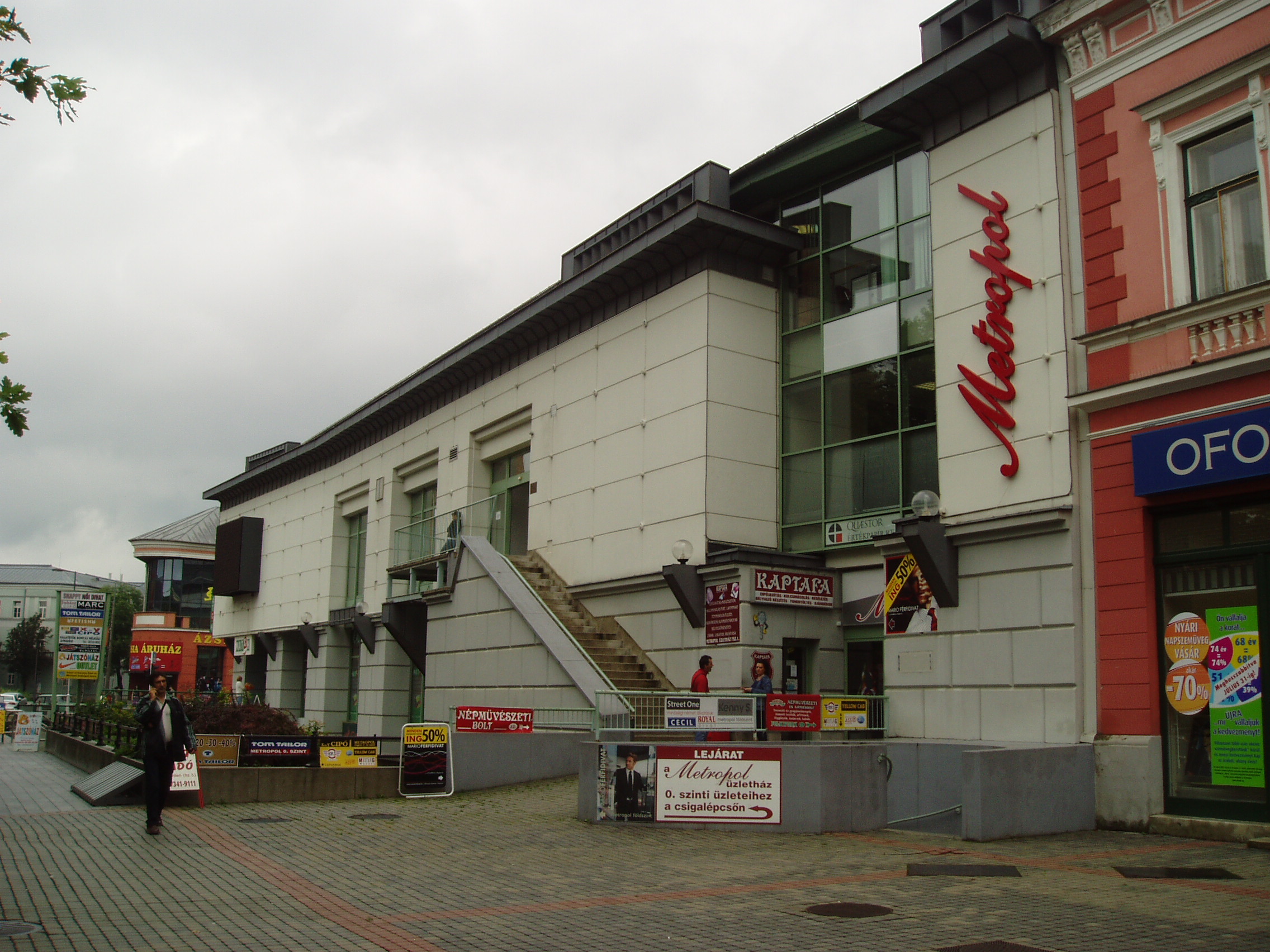 Nyilvános 1136 | 3671 | Nyíregyháza, Kossuth tér 8. | A Kossuth tér déli részét ma a modern Metropol üzletház uralja. Valaha itt állt az 1793-ban felépült városháza, amelyben - a napóleoni hadak elől menekülve - 1809-ben megszállt Ferenc császár felesége a trónörökössel, a leendő V. Ferdinánddal, s állítólag magával hurcolta a koronát is. Később itt működött Benczúr gyógyszerész "Magyar Korona" nevű gyógyszertára, s ebben az épületben született 1844-ben fia, Benczúr Gyula festőművész. Felh. irod.: Látnivalók Szabolcs-Szatmár-Bereg megyében. Miskolc, Well-PRess, 1999 A fénykép 2010 augusztus elején készült. |