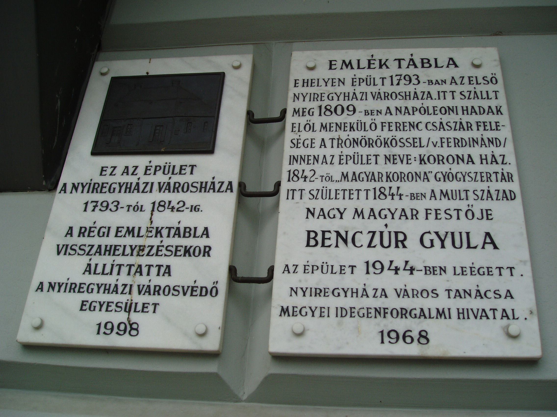 Nyilvános 1151 | 1634 | Nyíregyháza, Kossuth tér 8. | A Kossuth tér déli részét ma a modern Metropol üzletház uralja. Valaha itt állt az 1793-ban felépült városháza, amelyben - a napóleoni hadak elől menekülve - 1809-ben megszállt Ferenc császár felesége a trónörökössel, a leendő V. Ferdinánddal, s állítólag magával hurcolta a koronát is. Később itt működött Benczúr gyógyszerész "Magyar Korona" nevű gyógyszertára, s ebben az épületben született 1844-ben fia, Benczúr Gyula festőművész. Felh. irod.: Látnivalók Szabolcs-Szatmár-Bereg megyében. Miskolc, Well-PRess, 1999 A fénykép 2010 augusztus elején készült. |