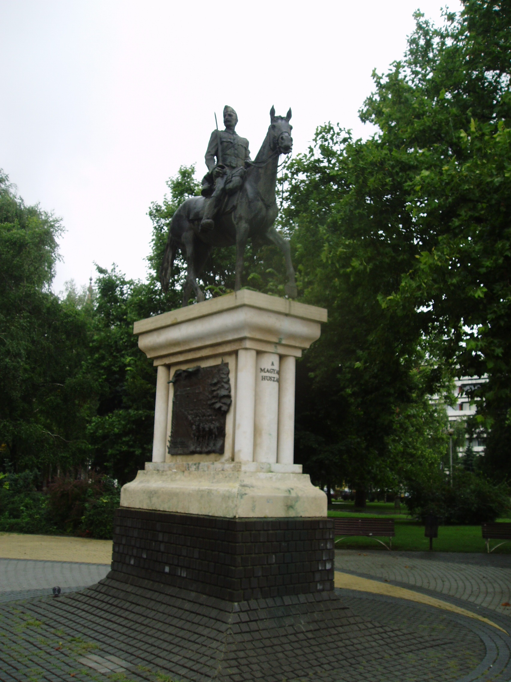 Nyilvános 1150 | 1990 | Nyíregyháza, Országzászló tér: Magyar huszár emlékmű | Győrfi Sándor alkotása az Országzászló téren elhelyezett "A magyar huszár" című emlékmű. Főalakja egy díszszemlén léptető, Bocskai sapkás huszárt ábrázol. A talapzat két oldalán látható domborművek közül az egyik a Hadik-huszárok rohamát idézi fel a napóleoni háborúk korából, míg a másik utolsó kivonulásukat a frontra 1944 nyarán. A kivonuló katonák hátterében a nyíregyházi laktanya épületét örökítette meg a szobrász. Felh. irod.: www.szoborlap.hu A fénykép 2010 augusztus elején készült. |