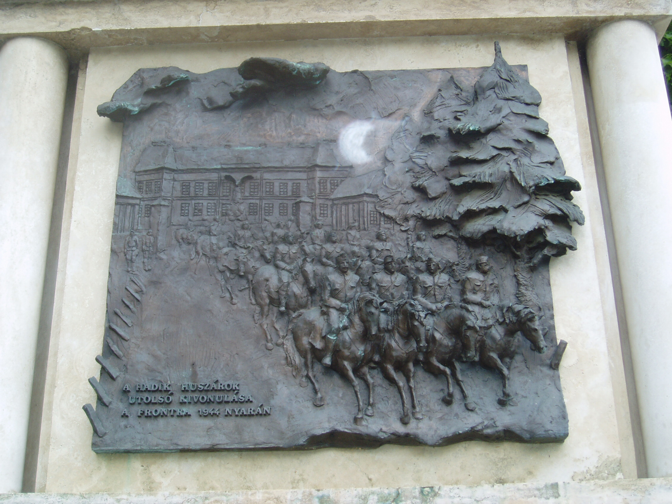 Nyilvános 1168 | 1739 | Nyíregyháza, Országzászló tér: Magyar huszár emlékmű | Győrfi Sándor alkotása az Országzászló téren elhelyezett "A magyar huszár" című emlékmű. A talapzat két oldalán látható domborművek közül a második a huszárok utolsó kivonulását a frontra 1944 nyarán. A háttérben a nyíregyházi laktanya épületét örökítette meg a szobrász. Felh. irod.: www.szoborlap.hu A fénykép 2010 augusztus elején készült. |