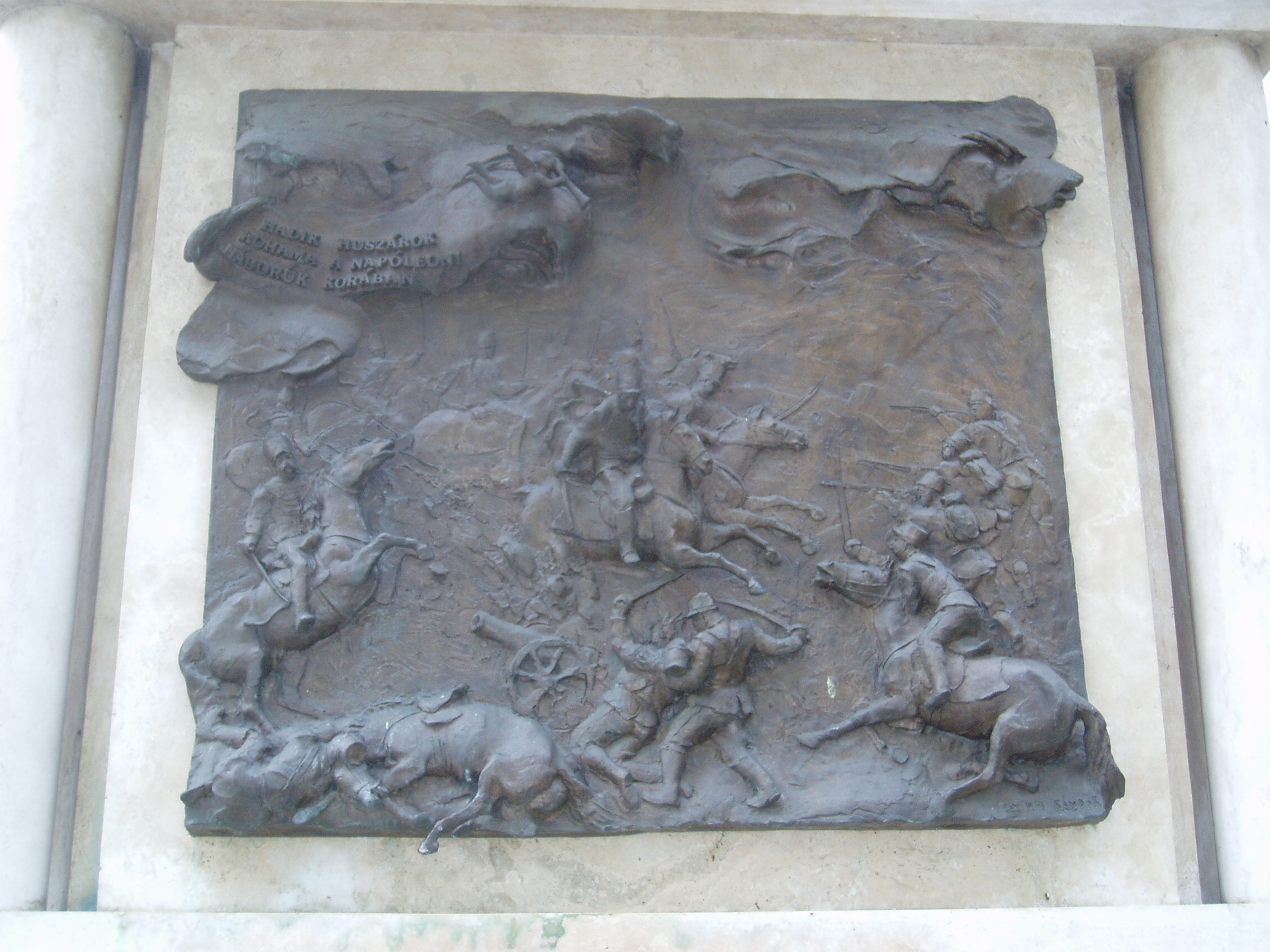 Nyilvános 1103 | 1537 | Nyíregyháza, Országzászló tér: Magyar huszár emlékmű | Győrfi Sándor alkotása az Országzászló téren elhelyezett "A magyar huszár" című emlékmű. A talapzat két oldalán látható domborművek közül az egyik a Hadik-huszárok rohamát idézi fel a napóleoni háborúk korából. Felh. irod.: www.szoborlap.hu A fénykép 2010 augusztus elején készült. |
