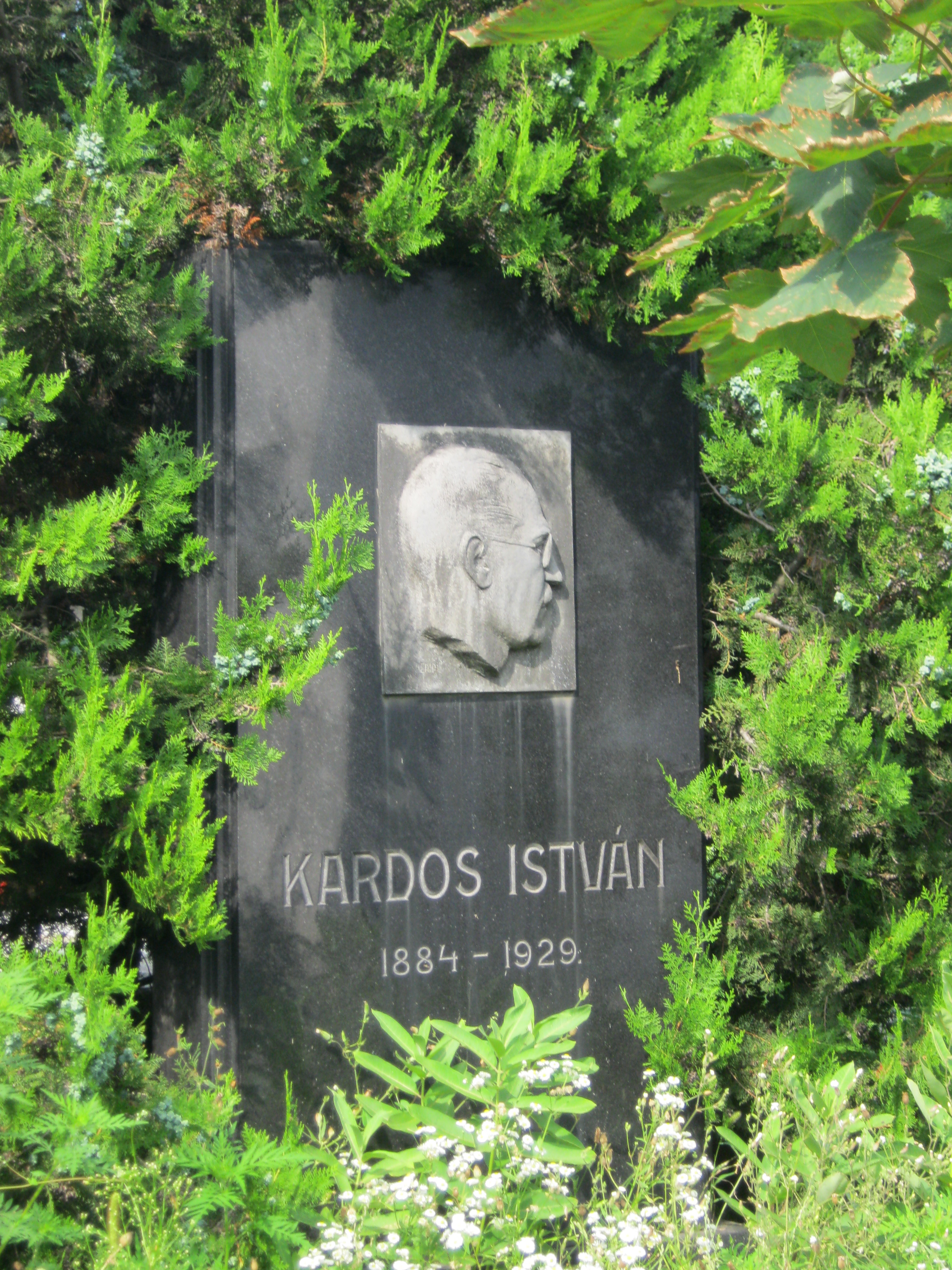 Nyilvános 1155 | 1746 | Nyíregyháza, Pazonyi tér, Északi temető: Kardos István | A Dózsa György út vezet Nyíregyháza Északi temetőjébe. Itt nyugszik Kardos István (1884-1929), Nyíregyháza kulturális életének egyik fontos alakja: kultúrtanácsnok és a Bessenyei Kör főtitkára. Arcvonásait bronz dombormű őrzi síremlékén, amelyet 1940-ben a Bessenyei Kör állíttatott fel. Felh. irod.: Fazekas Árpád - Szekrényes András: Nyíregyháza temetői. Nyíregyháza, 1990 A fénykép 2010 augusztus elején készült |