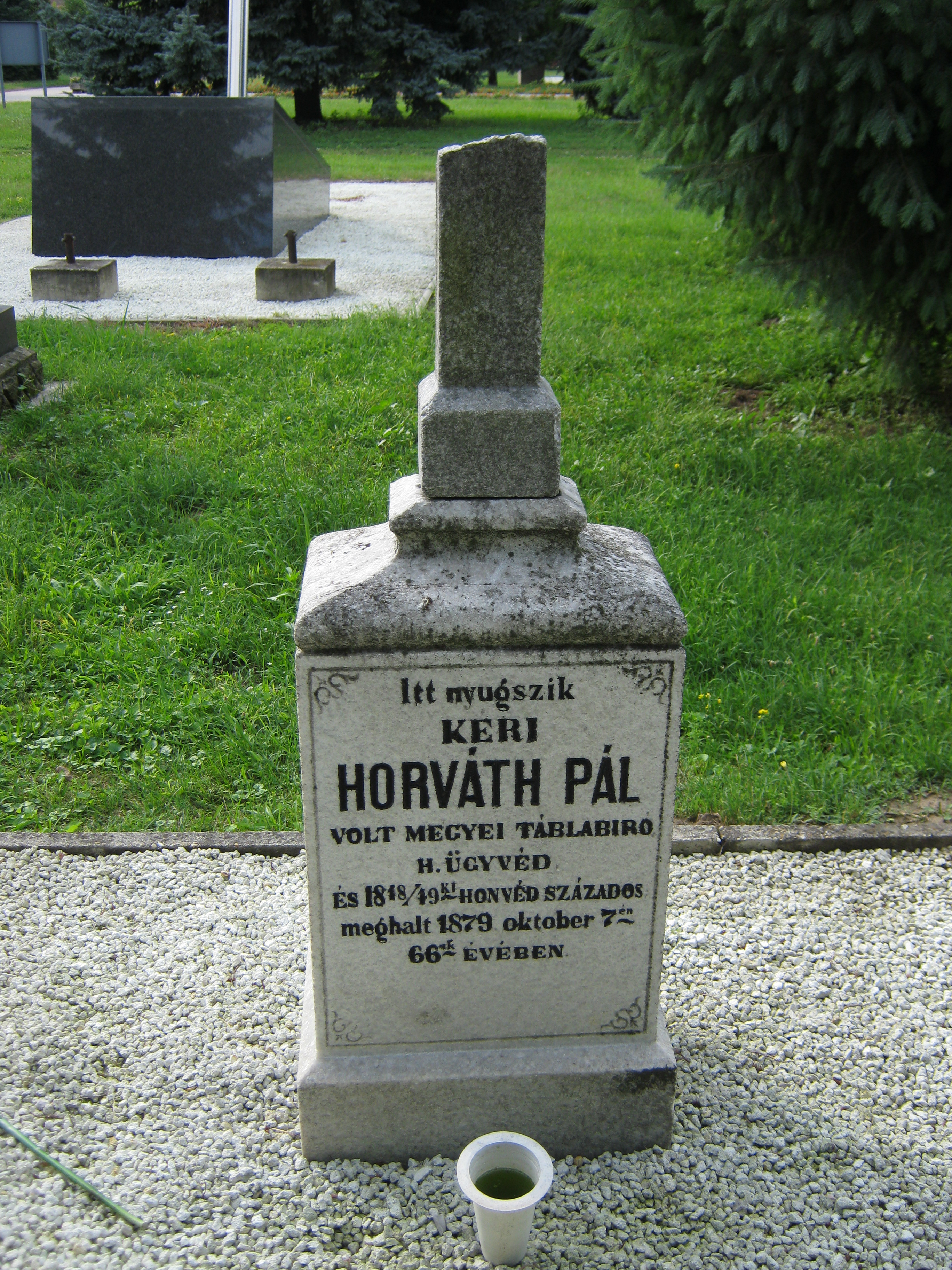 Nyilvános 1105 | 1741 | Nyíregyháza, Pazonyi tér, Északi temető: Horváth Pál, kéri | A Dózsa György út vezet Nyíregyháza Északi temetőjébe. Itt nyugszik kéri Horváth Pál (1813-1879) megyei táblabíró, ügyvéd és 1848/49-es honvédszázados. Síremlékét az elbukott szabadságharcra utalva derékbatört oszlop díszíti. Felh. irod.: Fazekas Árpád - Szekrényes András: Nyíregyháza temetői. Nyíregyháza, 1990 A fénykép 2010 augusztus elején készült |