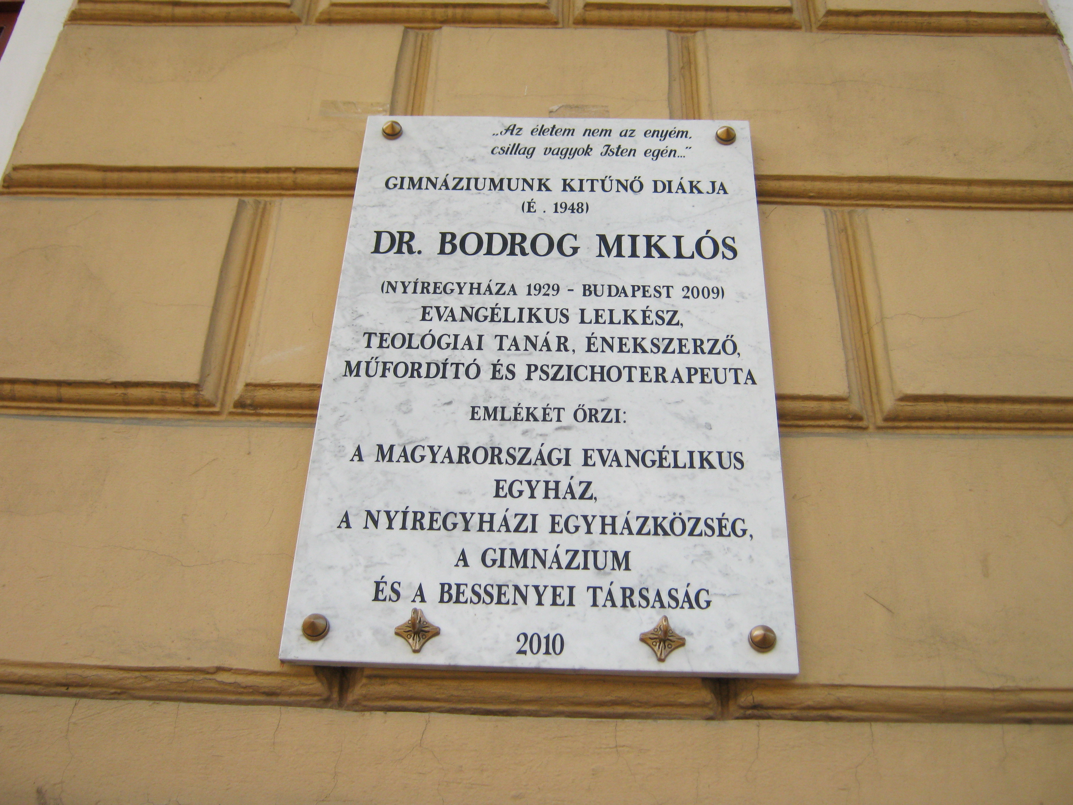 Nyilvános 1111 | 1486 | Nyíregyháza, Szent István utca 19. Evangélikus Kossuth Lajos Gimnázium | A megye legrégibb középiskolája. 1808-ban alapították mint evangélikus professzori iskolát (lásd: Nyíregyháza, Luther utca 5.). Nyolc osztályos gimnáziummá 1888-ra fejlesztették fel. Mai épületét ekkoriban, 1887-ben emelték Bobula János tervei szerint. Kossuth Lajos nevét 1921-ben vette fel. Az 1948-ban államosított iskolát 1992-ben kapta vissza az evangélikus egyház. Homlokzatán számos márványtábla emlékezik kiváló diákjaira, tanáraira. Itt végezte tanulmányait Bodrog Miklós evangélikus lelkész, teológiai tanár, énekszerző és pszichoterapeuta itt érettségizett 1948-ban. Felh. irod.: www.eklg.hu A fénykép 2010 augusztus elején készült |