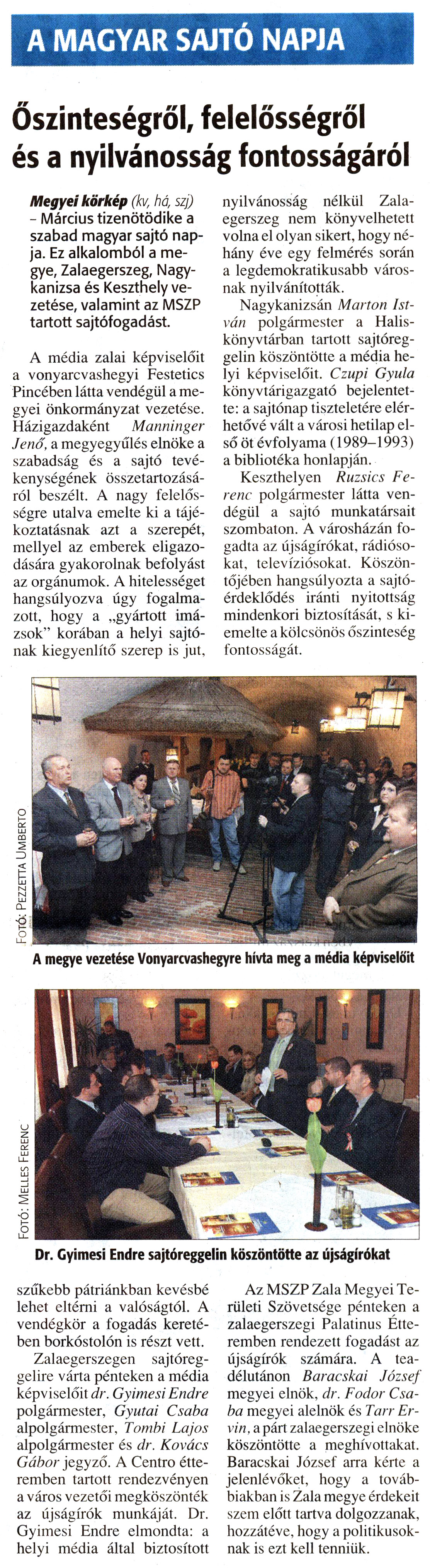 Nyilvános 1392 | 2827 | Zalai Hírlap 2008. március 17. 64. szám 4. oldal - A Magyar Sajtó Napja | A cikkben említett "városi hetilap első öt évfolyama (1989-1993)" a Kanizsa - Dél-Zalai Hetilap első öt évfolyamát jelenti. Elérhető a következő link mögött: http://www.nagykar.hu/ekonyvek/451.html Ugyanitt válik elérhetővé a lap minden további digitalizált példánya. Az eseményről, melyről a Zalai Hírlap tudósít, további képek találhatók a következő link mögött: http://www.nagykar.hu/keptar/2907.html A MAGYAR SAJTÓ NAPJA Őszinteségről, felelősségről és a nyilvánosság fontosságáról Megyei körkép (kvr há, szj) - Március tizenötödike a szabad magyar sajtó napja. Ez alkalomból a megye, Zalaegerszeg, Nagykanizsa és Keszthely vezetése, valamint az MSZP tartott sajtófogadást. A média zalai képviselőit a vonyarcvashegyi Festetics Pincében látta vendégül a megyei önkormányzat vezetése. Házigazdaként Manninger Jenő, a megyegyűlés elnöke a szabadság és a sajtó tevékenységének összetartozásáról beszélt. A nagy felelősségre utalva emelte ki a tájékoztatásnak azt a szerepét, mellyel az emberek eligazodására gyakorolnak befolyást az orgánumok. A hitelességet hangsúlyozva úgy fogalmazott, hogy a „gyártott imázsok" korában a helyi sajtónak kiegyenlítő szerep is jut, szűkebb pátriánkban kevésbé lehet eltérni a valóságtól. A vendégkör a fogadás keretében borkóstolón is részt vett. Zalaegerszegen sajtóreggelire várta pénteken a média képviselőit dr. Gyimesi Endre polgármester, Gyutai Csaba alpolgármester, Tombi Lajos alpolgármester és dr. Kovács Gábor jegyző. A Centro étteremben tartott rendezvényen a város vezetői megköszönték az újságírók munkáját. Dr. Gyimesi Endre elmondta: a helyi média által biztosított nyilvánosság nélkül Zalaegerszeg nem könyvelhetett volna el olyan sikert, hogy néhány éve egy felmérés során a legdemokratikusabb városnak nyilvánították. Nagykanizsán Marton István polgármester a Halis-könyvtárban tartott sajtóreggelin köszöntötte a média helyi képviselőit. Czupi Gyula könyvtárigazgató bejelentette: a sajtónap tiszteletére elérhetővé vált a városi hetilap első öt évfolyama (1989-1993) a bibliotéka honlapján. Keszthelyen Ruzsics Ferenc polgármester látta vendégül a sajtó munkatársait szombaton. A városházán fogadta az újságírókat, rádiósokat, televíziósokat. Köszöntőjében hangsúlyozta a sajtóérdeklődés iránti nyitottság mindenkori biztosítását, s kiemelte a kölcsönös őszinteség fontosságát. Az MSZP Zala Megyei Területi Szövetsége pénteken a zalaegerszegi Palatínus Étteremben rendezett fogadást az újságírók számára. A teadélutánon Baracskai József megyei elnök, dr. Fodor Csaba megyei alelnök és Tarr Er-vin, a párt zalaegerszegi elnöke köszöntötte a meghívottakat. Baracskai József arra kérte a jelenlévőket, hogy a továbbiakban is Zala megye érdekeit szem előtt tartva dolgozzanak, hozzátéve, hogy a politikusoknak is ezt kell tenniük. |