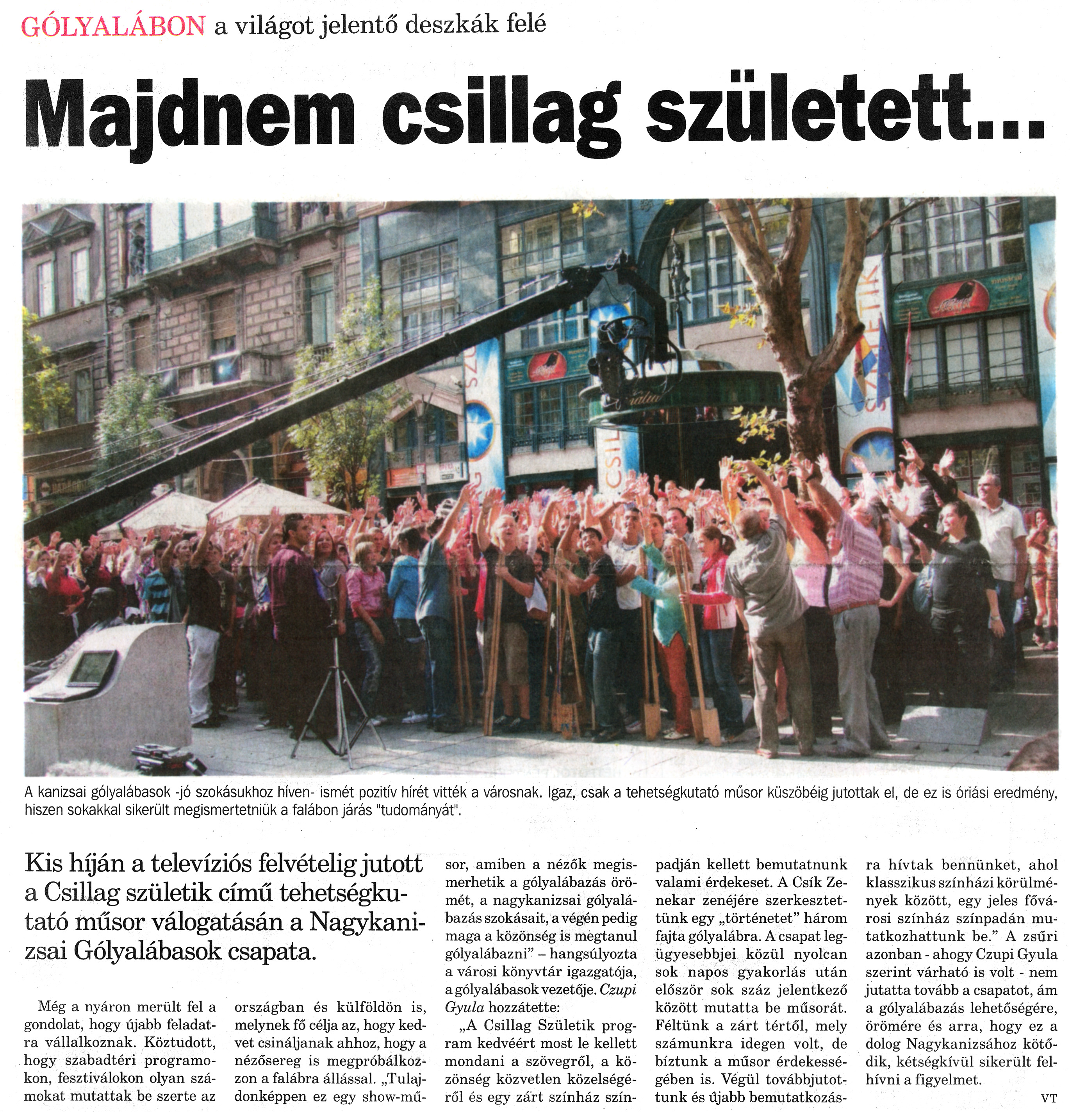 Nyilvános 1629 | 2531 | Nagykanizsai Maraton 2009.10.09. 040. szám 1. oldal - Majdnem csillag született | A cikk szövege: GÓLYALÁBON a világot jelentő deszkák felé Majdnem csillag született... Kis híján a televíziós felvételig jutott a Csillag születik című tehetségkutató műsor válogatásán a Nagykanizsai Gólyalábasok csapata. A kanizsai gólyalábasok - jó szokásukhoz híven - ismét pozitív hírét vitték a városnak. Igaz, csak a tehetségkutató műsor küszöbéig jutottak el, de ez is óriási eredmény, hiszen sokakkal sikerült megismertetniük a falábon járás "tudományát". Még a nyáron merült fel a gondolat, hogy újabb feladatra vállalkoznak. Köztudott, hogy szabadtéri programokon, fesztiválokon olyan számokat mutattak be szerte az országban és külföldön is, melynek fő célja az, hogy kedvet csináljanak ahhoz, hogy a nézősereg is megpróbálkozzon a falábra állással. „Tulajdonképpen ez egy show-műsor, amiben a nézők megismerhetik a gólyalábazás örömét, a nagykanizsai gólyalábazás szokásait, a végén pedig maga a közönség is megtanul gólyalábazni" - hangsúlyozta a városi könyvtár igazgatója, a gólyalábasok vezetője. Czupi Gyula hozzátette: „A Csillag Születik program kedvéért most le kellett mondani a szövegről, a közönség közvetlen közelségéről és egy zárt színház színpadján kellett bemutatnunk valami érdekeset. A Csík Zenekar zenéjére szerkesztettünk egy „történetet" három fajta gólyalábra. A csapat legügyesebbjei közül nyolcan sok napos gyakorlás után először sok száz jelentkező között mutatta be műsorát. Féltünk a zárt tértől, mely számunkra idegen volt, de bíztunk a műsor érdekességében is. Végül továbbjutottunk és újabb bemutatkozásra hívtak bennünket, ahol klasszikus színházi körülmények között, egy jeles fővárosi színház színpadán mutatkozhattunk be." A zsűri azonban - ahogy Czupi Gyula szerint várható is volt - nem jutatta tovább a csapatot, ám a gólyalábazás lehetőségére, örömére és arra, hogy ez a dolog Nagykanizsához kötődik, kétségkívül sikerült felhívni a figyelmet. VT |