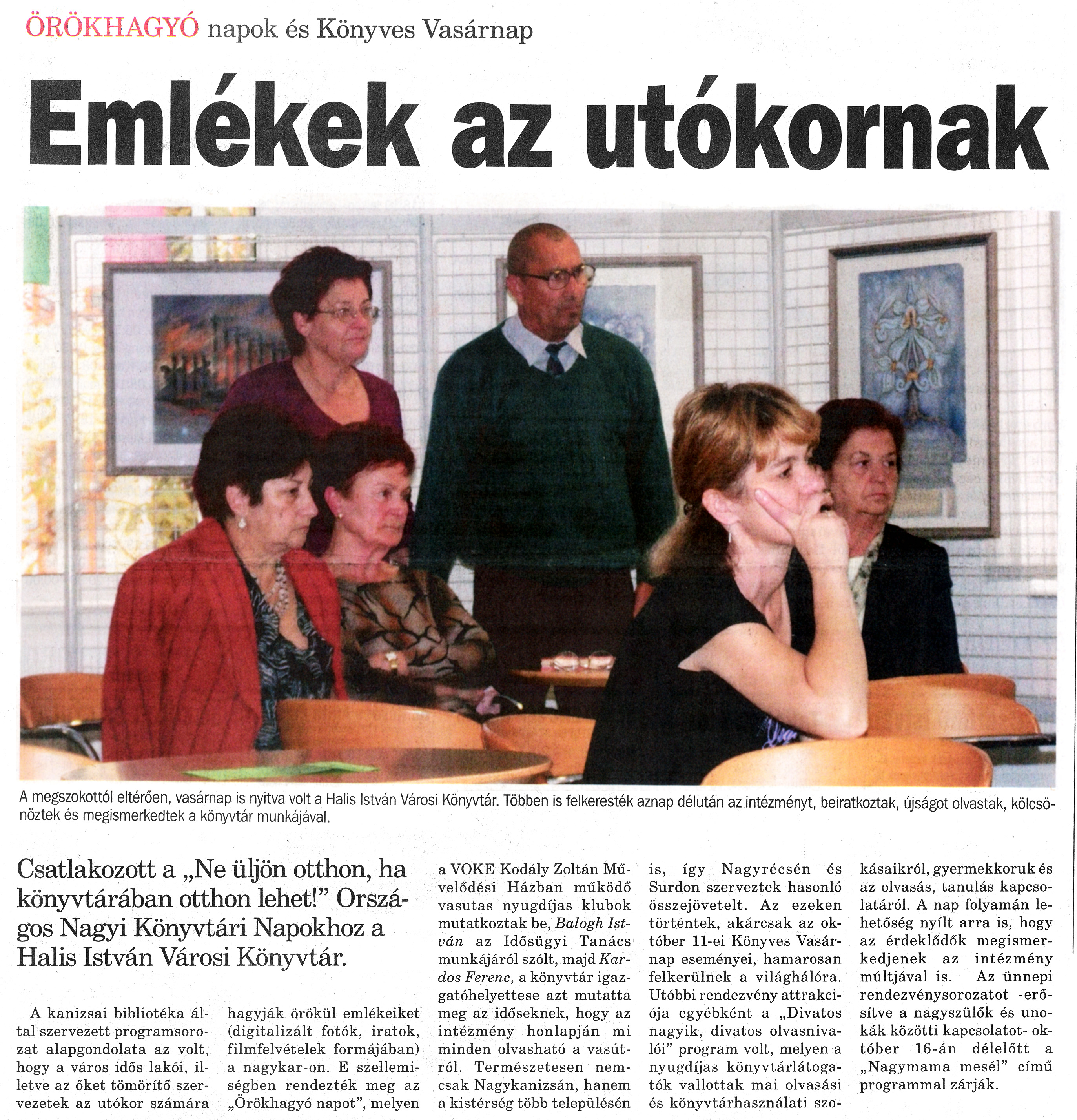 Nyilvános 1315 | 1764 | Nagykanizsai Maraton 2009.10.16. 041. szám 1. oldal - Emlékek az utókornak | A cikk szövege: ÖRÖKHAGYÓ napok és Könyves Vasárnap Emlékek az utókornak A megszokottól eltérően, vasárnap is nyitva volt a Halis István Városi Könyvtár. Többen is felkeresték aznap délután az intézményt, beiratkoztak, újságot olvastak kölcsönöztek és megismerkedtek a könyvtár munkájával. Csatlakozott a „Ne üljön otthon, ha könyvtárában otthon lehet!” Országos Nagyi Könyvtári Napokhoz a Halis István Városi Könyvtár. A kanizsai bibliotéka által szervezett programsorozat alapgondolata az volt, hogy a város idős lakói, illetve az őket tömörítő szervezetek az utókor számára hagyják örökül emlékeiket (digitalizált fotók, iratok, filmfelvételek formájában) a nagykar-on. E szellemiségben rendezték meg az „Örökhagyó napot”, melyen a VOKE Kodály Zoltán Művelődési Házban működő vasutas nyugdíjas klubok mutatkoztak be, Balogh István az Idősügyi Tanács munkájáról szólt, majd Kardos Ferenc, a könyvtár igazgatóhelyettese azt mutatta meg az időseknek, hogy az intézmény honlapján mi minden olvasható a vasútról. Természetesen nemcsak Nagykanizsán, hanem a kistérség több településén is, így Nagyrécsén és Surdon szerveztek hasonló összejövetelt. Az ezeken történtek, akárcsak az október 11-ei Könyves Vasárnap eseményei, hamarosan felkerülnek a világhálóra. Utóbbi rendezvény attrakciója egyébként a „Divatos nagyik, divatos olvasnivalói” program volt, melyen a nyugdíjas könyvtárlátogatók vallottak mai olvasási és könyvtárhasználati szokásaikról, gyermekkoruk és az olvasás, tanulás kapcsolatáról. A nap folyamán lehetőség nyílt arra is, hogy az érdeklődők megismerkedjenek az intézmény múltjával is. Az ünnepi rendezvénysorozatot -erősítve a nagyszülők és unokák közötti kapcsolatot- október 16-án délelőtt a „Nagymama mesél” című programmal zárják. |