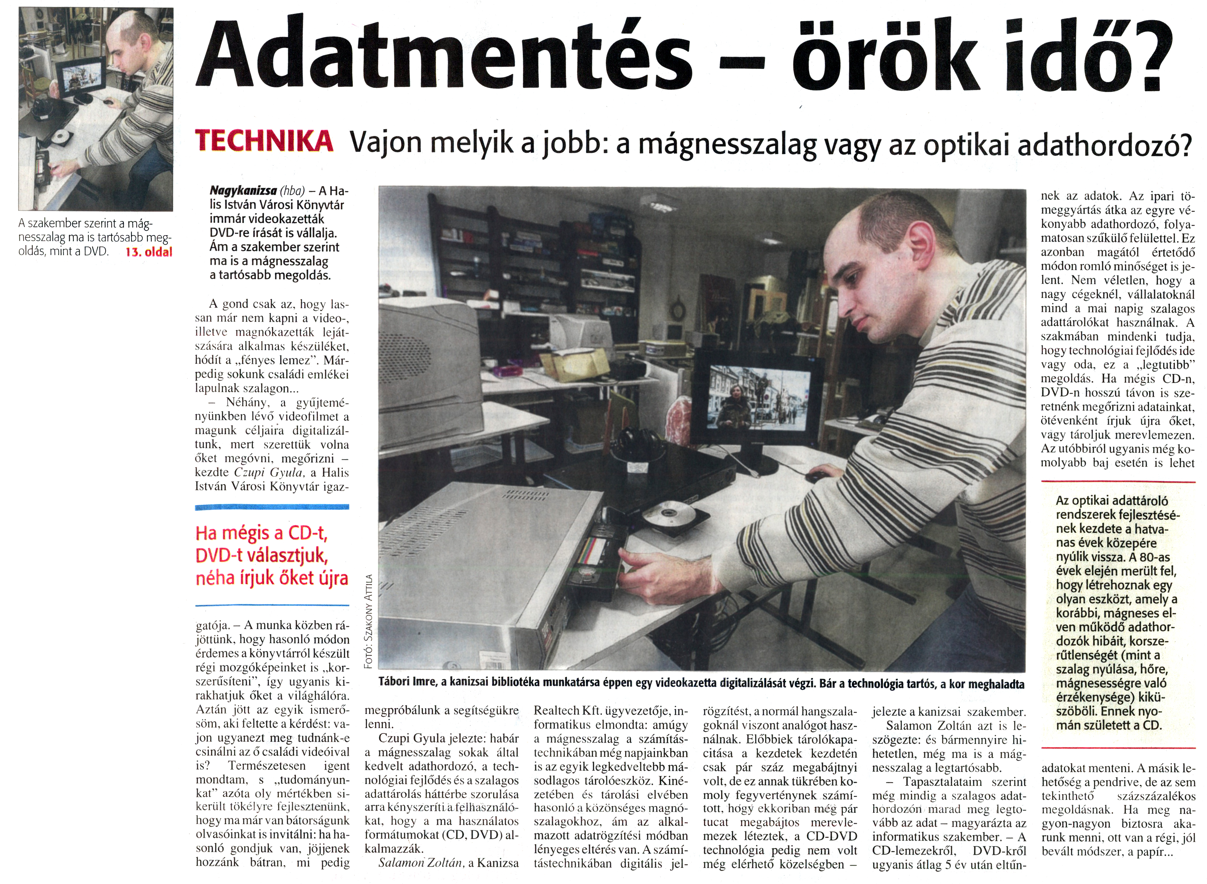 Nyilvános 1239 | 1771 | Zalai Hírlap 2010. március 18. 64. szám 13. oldal - Adatmentés - örök idő | A cikk szövege: Adatmentés - örök idő? TECHNIKA Vajon melyik a jobb: a mágnesszalag vagy az optikai adathordozó? Tábori Imre, a kanizsai bibliotéka munkatársa éppen egy videokazetta digitalizálását végzi. Bár a technológia tartós, a kor meghaladta A szakember szerint a mágnesszalag ma is tartósabb megoldás, mint a DVD. 13. oldal Nagykanizsa (hba) - A Ha-lis István Városi Könyvtár immár videokazetták DVD-re írását is vállalja. Ám a szakember szerint ma is a mágnesszalag a tartósabb megoldás. A gond csak az, hogy lassan már nem kapni a videó-, illetve magnókazetták lejátszására alkalmas készüléket, hódít a „fényes lemez". Márpedig sokunk családi emlékei lapulnak szalagon... - Néhány, a gyűjteményünkben lévő videofilmet a magunk céljaira digitalizáltunk, mert szerettük volna őket megóvni, megőrizni -kezdte Czupi Gyula, a Halis István Városi Könyvtár igaz- Ha mégis a CD-t, DVD-t választjuk, néha írjuk őket újra gatója. - A munka közben rájöttünk, hogy hasonló módon érdemes a könyvtárról készült régi mozgóképeinket is „korszerűsíteni", így ugyanis kirakhatjuk őket a világhálóra. Aztán jött az egyik ismerősöm, aki feltette a kérdést: vajon ugyanezt meg tudnánk-e csinálni az ő családi videóival is? Természetesen igent mondtam, s „tudományunkat" azóta oly mértékben sikerült tökélyre fejlesztenünk, hogy ma már van bátorságunk olvasóinkat is invitálni: ha hasonló gondjuk van, jöjjenek hozzánk bátran, mi pedig megpróbálunk a segítségükre lenni. Czupi Gyula jelezte: habár a mágnesszalag sokak által kedvelt adathordozó, a technológiai fejlődés és a szalagos adattárolás háttérbe szorulása arra kényszeríti a felhasználókat, hogy a ma használatos formátumokat (CD. DVD) alkalmazzák. Salamon Zoltán, a Kanizsa Realtech Kft. ügyvezetője, informatikus elmondta: amúgy a mágnesszalag a számítástechnikában még napjainkban is az egyik legkedveltebb másodlagos tárolóeszköz. Kinézetében és tárolási elvében hasonló a közönséges magnószalagokhoz, ám az alkalmazott adatrögzítési módban lényeges eltérés van. A számítástechnikában digitális jel- rögzítést, a normál hangszalagoknál viszont analógot használnak. Előbbiek tárolókapacitása a kezdetek kezdetén csak pár száz megabájtnyi volt, de ez annak tükrében komoly fegyverténynek számított, hogy ekkoriban még pár tucat megabájtos merevlemezek léteztek, a CD-DVD technológia pedig nem volt még elérhető közelségben - jelezte a kanizsai szakember. Salamon Zoltán azt is leszögezte: és bármennyire hihetetlen, még ma is a mágnesszalag a legtartósabb. - Tapasztalataim szerint még mindig a szalagos adathordozón marad meg legtovább az adat - magyarázta az informatikus szakember. - A CD-lemezekről, DVD-kről ugyanis átlag 5 év után eltűn- nek az adatok. Az ipari tömeggyártás átka az egyre vékonyabb adathordozó, folyamatosan szűkülő felülettel. Ez azonban magától értetődő módon romló minőséget is jelent. Nem véletlen, hogy a nagy cégeknél, vállalatoknál mind a mai napig szalagos adattárolókat használnak. A szakmában mindenki tudja, hogy technológiai fejlődés ide vagy oda, ez a „legtutibb" megoldás. Ha mégis CD-n, DVD-n hosszú távon is szeretnénk megőrizni adatainkat, ötévenként írjuk újra őket, vagy tároljuk merevlemezen. Az utóbbiról ugyanis még komolyabb baj esetén is lehet Az optikai adattároló rendszerek fejlesztésének kezdete a hatvanas évek közepére nyúlik vissza. A 80-as évek elején merült fel, hogy létrehoznak egy olyan eszközt, amely a korábbi, mágneses elven működő adathordozók hibáit, korszerűtlenségét (mint a szalag nyúlása, hőre, mágnesességre való érzékenysége) kiküszöböli. Ennek nyomán született a CD. adatokat menteni. A másik lehetőség a pendrive, de az sem tekinthető százszázalékos megoldásnak. Ha meg nagyon-nagyon biztosra akarunk menni, ott van a régi, jól bevált módszer, a papír... |