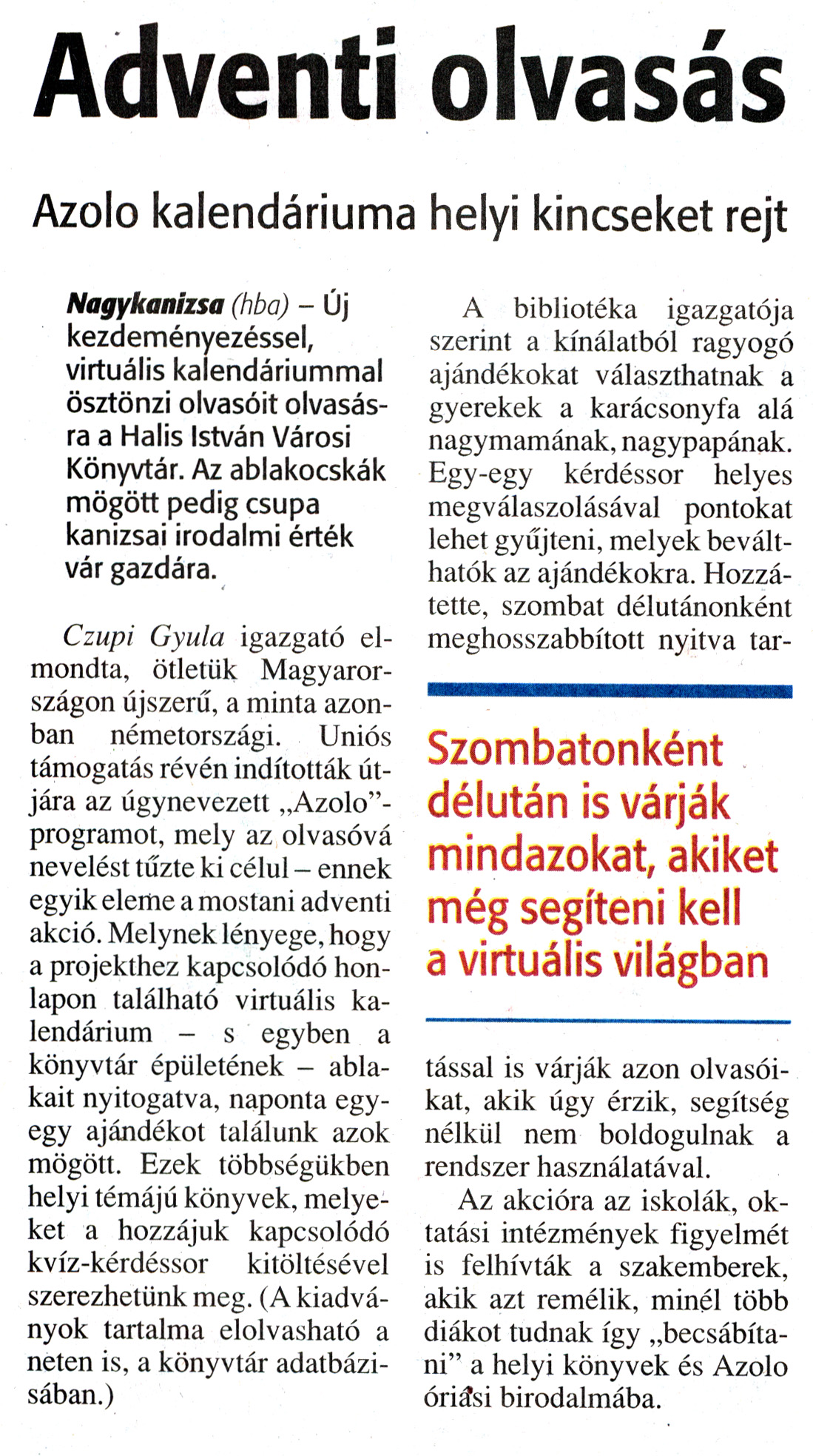 Nyilvános 1791 | 4735 | Zalai Hírlap 2010. december 7. 284. szám 11. oldal - Adventi olvasás | A cikk szövege: Adventi olvasás Azolo kalendáriuma helyi kincseket rejt Nagykanizsa (hba) - Új kezdeményezéssel, virtuális kalendáriummal ösztönzi olvasóit olvasásra a Halis István Városi Könyvtár. Az ablakocskák mögött pedig csupa kanizsai irodalmi érték vár gazdára. Czupi Gyula igazgató elmondta, ötletük Magyarországon újszerű, a minta azonban németországi. Uniós támogatás révén indították útjára az úgynevezett „Azolo"-programot, mely az olvasóvá nevelést tűzte ki célul - ennek egyik eleme a mostani adventi akció. Melynek lényege, hogy a projekthez kapcsolódó honlapon található virtuális kalendárium - s egyben a könyvtár épületének - ablakait nyitogatva, naponta egy-egy ajándékot találunk azok mögött. Ezek többségükben helyi témájú könyvek, melyeket a hozzájuk kapcsolódó kvíz-kérdéssor kitöltésével szerezhetünk meg. (A kiadványok tartalma elolvasható a neten is, a könyvtár adatbázisában.) A bibliotéka igazgatója szerint a kínálatból ragyogó ajándékokat választhatnak a gyerekek a karácsonyfa alá nagymamának, nagypapának. Egy-egy kérdéssor helyes megválaszolásával pontokat lehet gyűjteni, melyek beválthatók az ajándékokra. Hozzátette, szombat délutánonként meghosszabbított nyitva tartással is várják azon olvasóikat, akik úgy érzik, segítség nélkül nem boldogulnak a rendszer használatával. Az akcióra az iskolák, oktatási intézmények figyelmét is felhívták a szakemberek, akik azt remélik, minél több diákot tudnak így „becsábítani" a helyi könyvek és Azolo óriási birodalmába. Szombatonként délután is várják mindazokat, akiket még segíteni kell a virtuális világban |
