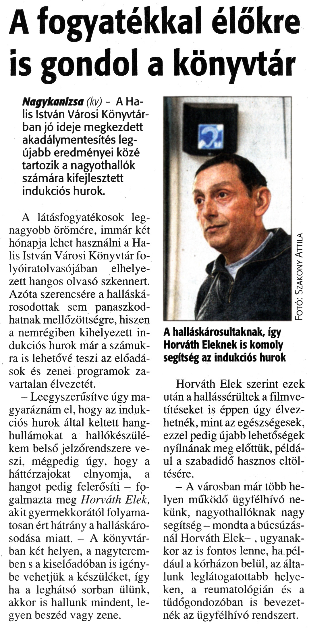 Nyilvános 1784 | 4681 | Zalai Hírlap 2011. január 14. 11. szám 11. oldal - A fogyatékkal élőkre is gondol a könyvtár | A cikk szövege: A fogyatékkal élőkre is gondol a könyvtár Nagykanizsa (kv) - A Halis István Városi Könyvtárban jó ideje megkezdett akadálymentesítés legújabb eredményei közé tartozik a nagyothallók számára kifejlesztett indukciós hurok. A látásfogyatékosok legnagyobb örömére, immár két hónapja lehet használni a Halis István Városi Könyvtár folyóiratolvasójában elhelyezett hangos olvasó szkennert. Azóta szerencsére a halláskárosodottak sem panaszkodhatnak mellőzöttségre, hiszen a nemrégiben kihelyezett indukciós hurok már a számukra is lehetővé teszi az előadások és zenei programok zavartalan élvezetét. - Leegyszerűsítve úgy magyaráznám el, hogy az indukciós hurok által keltett hanghullámokat a hallókészülékem belső jelzőrendszere veszi, mégpedig úgy, hogy a háttérzajokat elnyomja, a hangot pedig felerősíti - fogalmazta meg Horváth Elek, akit gyermekkorától folyamatosan ért hátrány a halláskárosodása miatt. - A könyvtárban két helyen, a nagyteremben s a kiselőadóban is igénybe vehetjük a készüléket, így ha a leghátsó sorban ülünk, akkor is hallunk mindent, legyen beszéd vagy zene. A halláskárosultaknak, így Horváth Eleknek is komoly segítség az indukciós hurok Horváth Elek szerint ezek után a hallássérültek a filmvetítéseket is éppen úgy élvezhetnék, mint az egészségesek, ezzel pedig újabb lehetőségek nyílnának meg előttük, például a szabadidő hasznos eltöltésére. - A városban már több helyen működő ügyfélhívó nekünk, nagyothallóknak nagy segítség - mondta a búcsúzásnál Horváth Elek –, ugyanakkor az is fontos lenne, ha például a kórházon belül, az általunk leglátogatottabb helyeken, a reumatológián és a tüdőgondozóban is bevezetnék az ügyfélhívó rendszert. Fotó: Szakony Attila |