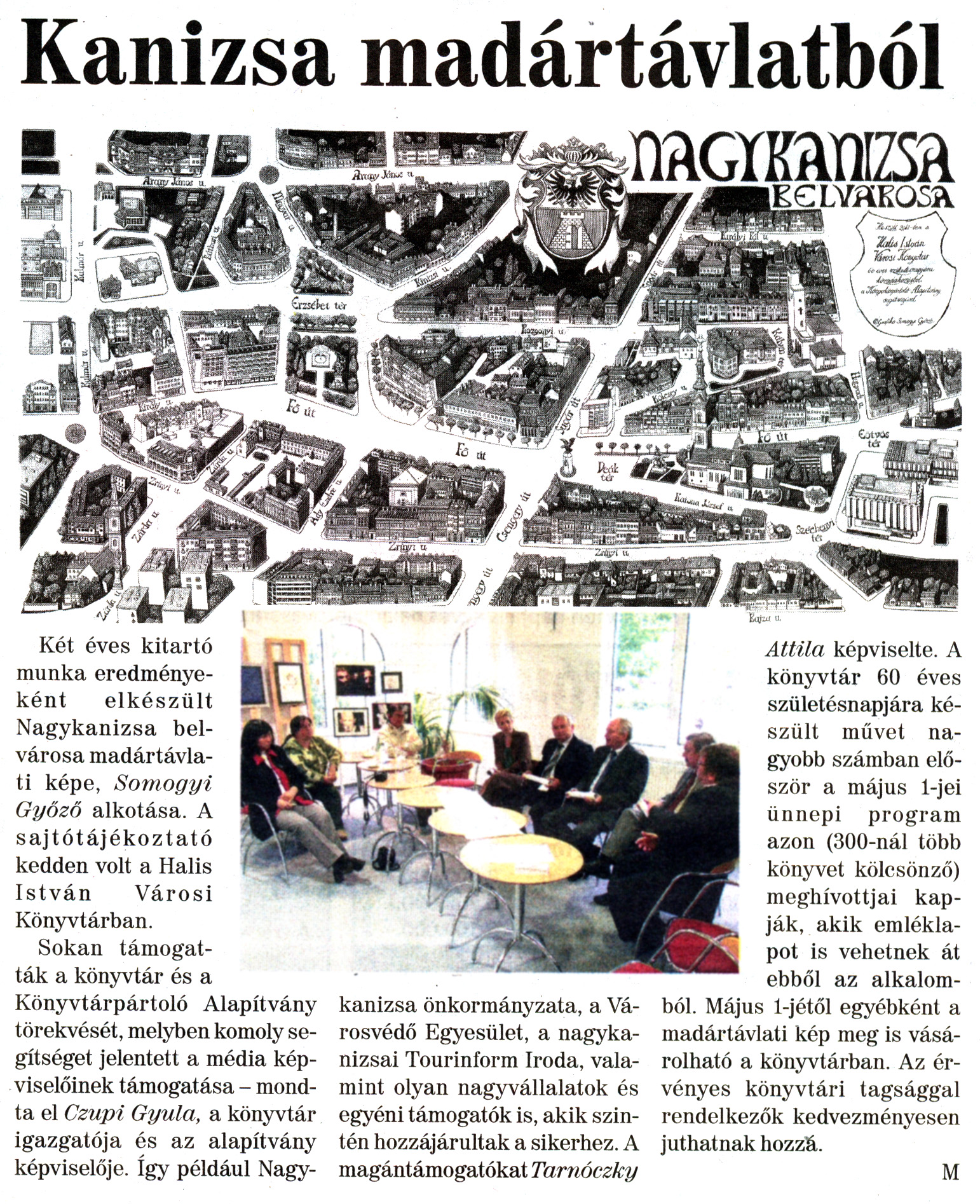 Nyilvános 2178 | 7364 | Nagykanizsai Maraton 2011. április 29. 17. szám 2. oldal - Kanizsa madártávlatból | A cikk szövege: Kanizsa madártávlatból Két éves kitartó munka eredményeként elkészült Nagykanizsa belvárosa madártávlati képe, Somogyi Győző alkotása. A sajtótájékoztató kedden volt a Halis István Városi Könyvtárban. Sokan támogatták a könyvtár és a Könyvtárpártoló Alapítvány törekvését, melyben komoly segítséget jelentett a média képviselőinek támogatása - mondta el Czupi Gyula, a könyvtár igazgatója és az alapítvány képviselője. Így például Nagy- kanizsa önkormányzata, a Városvédő Egyesület, a nagykanizsai Tourinform Iroda, valamint olyan nagyvállalatok és egyéni támogatók is, akik szintén hozzájárultak a sikerhez. A magántámogatókat Tarnóczky Attila képviselte. A könyvtár 60 éves születésnapjára készült művet nagyobb számban először a május 1-jei ünnepi program azon (300-nál több könyvet kölcsönző) meghívottjai kapják, akik emléklapot is vehetnek át ebből az alkalomból. Május 1-jétől egyébként a madártávlati kép meg is vásárolható a könyvtárban. Az érvényes könyvtári tagsággal rendelkezők kedvezményesen juthatnak hozzá. M |
