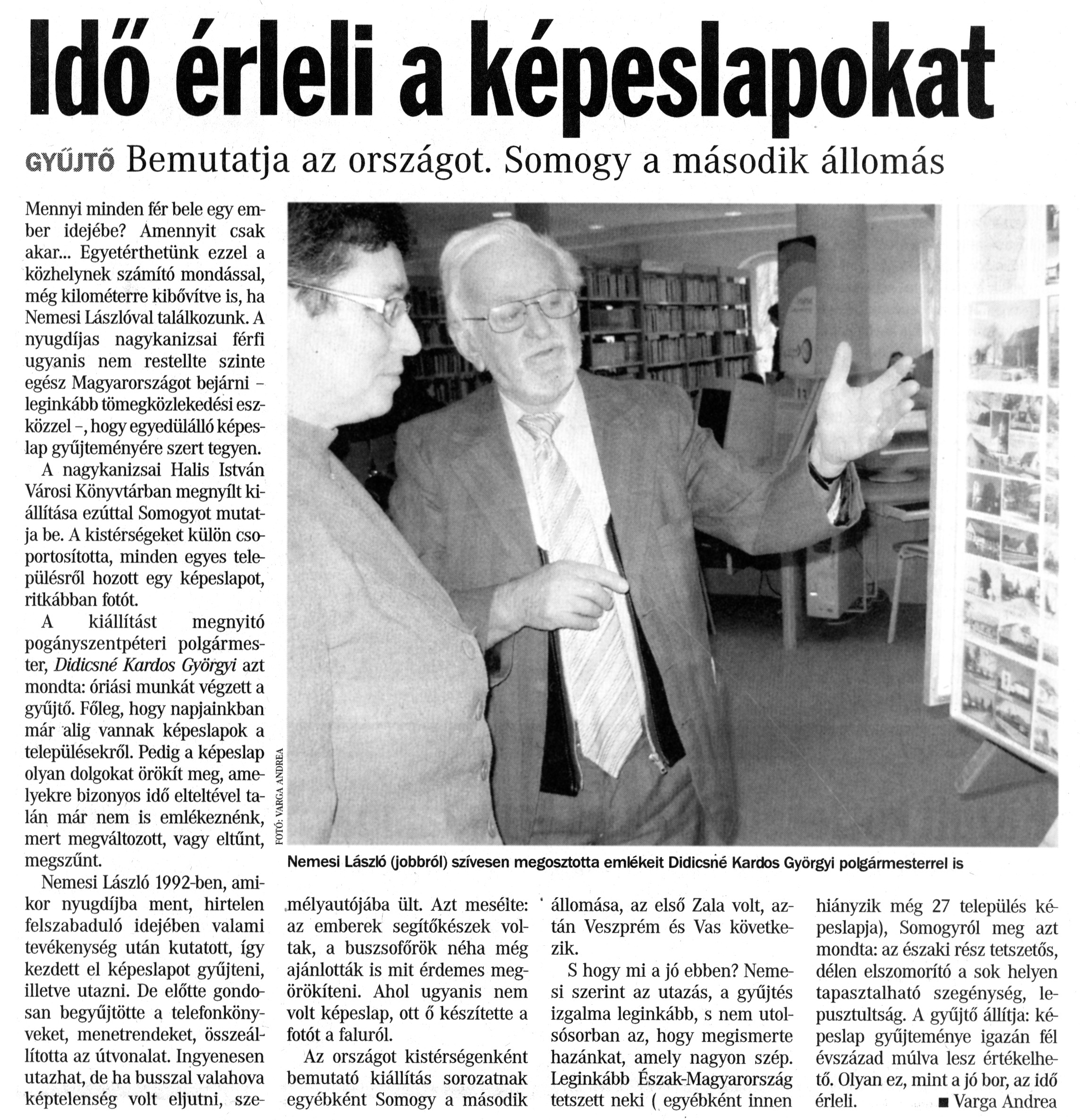 Nyilvános 1887 | 5049 | Somogyi Hírlap 2011. február 5. 30. szám 14. oldal - Idő érleli a képeslapokat | A cikk szövege: Idő érleli a képeslapokat gyűjtő Bemutatja az országot. Somogy a második állomás Nemesi László (jobbról) szívesen megosztotta emlékeit Didicsné Kardos Györgyi polgármesterrel is Mennyi minden fér bele egy ember idejébe? Amennyit csak akar... Egyetérthetünk ezzel a közhelynek számító mondással, még kilométerre kibővítve is, ha Nemesi Lászlóval találkozunk. A nyugdíjas nagykanizsai férfi ugyanis nem restellte szinte egész Magyarországot bejárni -leginkább tömegközlekedési eszközzel hogy egyedülálló képeslap gyűjteményére szert tegyen. A nagykanizsai Halis István Városi Könyvtárban megnyílt kiállítása ezúttal Somogyot mutatja be. A kistérségeket külön csoportosította, minden egyes településről hozott egy képeslapot, ritkábban fotót. A kiállítást megnyitó pogányszentpéteri polgármester, Didicsné Kardos Györgyi azt mondta: óriási munkát végzett a gyűjtő. Főleg, hogy napjainkban már alig vannak képeslapok a településekről. Pedig a képeslap olyan dolgokat örökít meg, amelyekre bizonyos idő elteltével talán már nem is emlékeznénk, mert megváltozott, vagy eltűnt, megszűnt. Nemesi László 1992-ben, amikor nyugdíjba ment, hirtelen felszabaduló idejében valami tevékenység után kutatott, így kezdett el képeslapot gyűjteni, illetve utazni. De előtte gondosan begyűjtötte a telefonkönyveket, menetrendeket, összeállította az útvonalat. Ingyenesen utazhat, de ha busszal valahova képtelenség volt eljutni, személyautójába ült. Azt mesélte: az emberek segítőkészek voltak, a buszsofőrök néha még ajánlották is mit érdemes megörökíteni. Ahol ugyanis nem volt képeslap, ott ő készítette a fotót a faluról. Az országot kistérségenként bemutató kiállítás sorozatnak egyébként Somogy a második állomása, az első Zala volt, aztán Veszprém és Vas következik. S hogy mi a jó ebben? Nemesi szerint az utazás, a gyűjtés izgalma leginkább, s nem utolsósorban az, hogy megismerte hazánkat, amely nagyon szép. Leginkább Észak-Magyarország tetszett neki (egyébként innen hiányzik még 27 település képeslapja), Somogyról meg azt mondta: az északi rész tetszetős, délen elszomorító a sok helyen tapasztalható szegénység, le-pusztultság. A gyűjtő állítja: képeslap gyűjteménye igazán fél évszázad múlva lesz értékelhető. Olyan ez, mint a jó bor, az idő érleli. Varga Andrea |