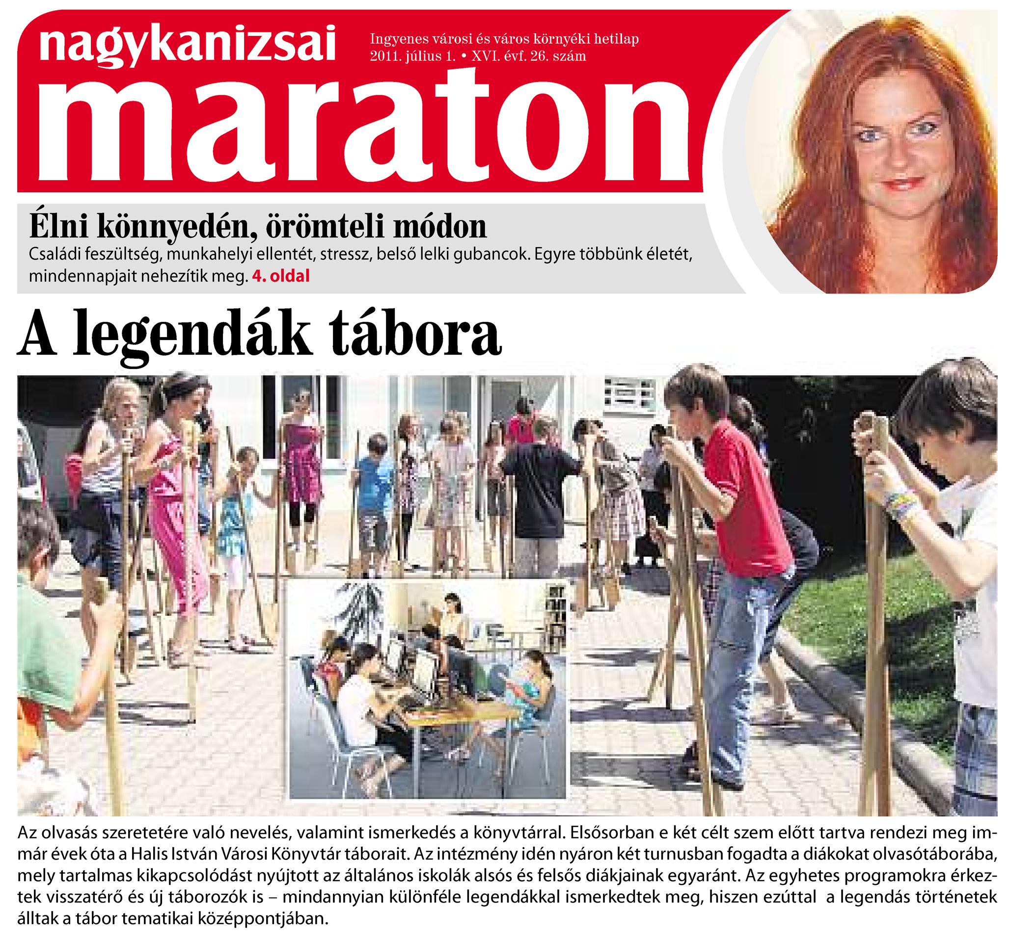 Nyilvános 2266 | 7945 | Nagykanizsai Maraton 2011. július 1. 26. szám 1. oldal - A legendák tábora | A legendák tábora Az olvasás szeretetére való nevelés, valamint ismerkedés a könyvtárral. Elsősorban e két célt szem előtt tartva rendezi meg immár évek óta a Halis István Városi Könyvtár táborait. Az intézmény idén nyáron két turnusban fogadta a diákokat olvasótáborába, mely tartalmas kikapcsolódást nyújtott az általános iskolák alsós és felsős diákjainak egyaránt. Az egyhetes programokra érkeztek visszatérő és új táborozók is – mindannyian különféle legendákkal ismerkedtek meg, hiszen ezúttal a legendás történetek álltak a tábor tematikai középpontjában. |