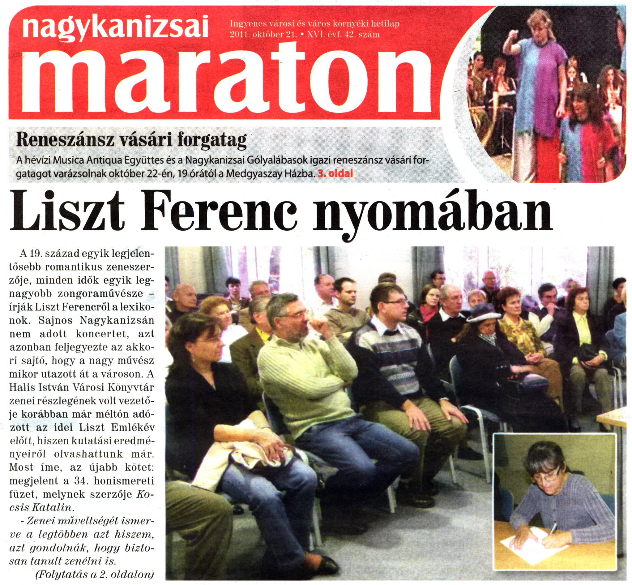 Nyilvános 2301 | 7440 | Nagykanizsai Maraton 2011. október 21. 42. szám 1. oldal - Liszt Ferenc nyomában | A cikk szövege: Liszt Ferenc nyomában A19. század egyik legjelentősebb romantikus zeneszerzője, minden idők egyik legnagyobb zongoraművésze -írják Liszt Ferencről a lexikonok. Sajnos Nagykanizsán nem adott koncertet, azt azonban feljegyezte az akkori sajtó, hogy a nagy művész mikor utazott át a városon. A Halis István Városi Könyvtár zenei részlegének volt vezetője korábban már méltón adózott az idei Liszt Emlékév előtt, hiszen kutatási eredményeiről olvashattunk már. Most íme, az újabb kötet: megjelent a 34. honismereti füzet, melynek szerzője Kocsis Katalin. - Zenei műveltségét ismerve a legtöbben azt hiszem, azt gondolnák, hogy biztosan tanult zenélni is. (Folytatás a 2. oldalon) |