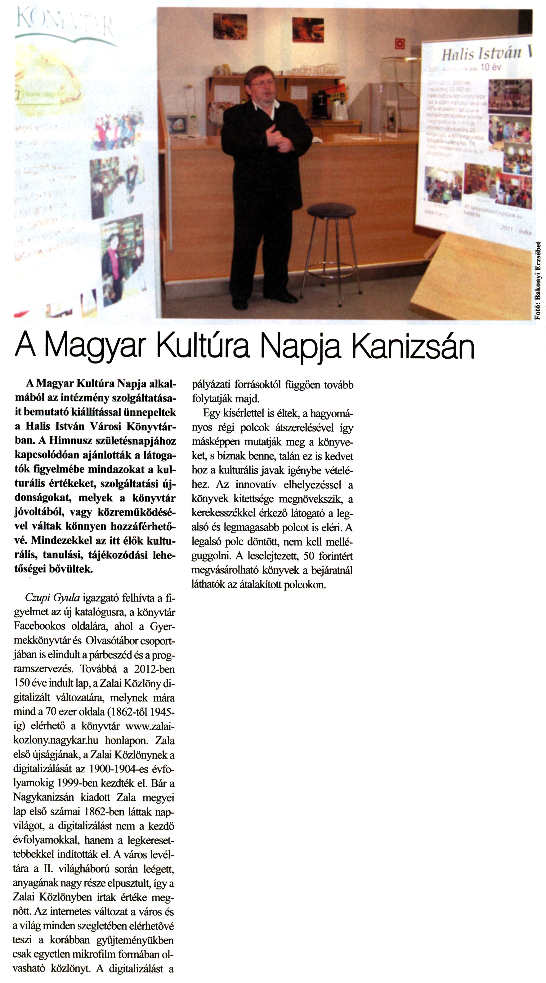 Nyilvános 2627 | 7920 | Rövid leírás | Teljes leírás (2.23 KB) | Kanizsa 2012. január 26. 3. szám 2. oldal - A Magyar Kultúra Napja Kanizsán A Magyar Kultúra Napja Kanizsán A Magyar Kultúra Napja alkalmából az intézmény szolgáltatásait bemutató kiállítással ünnepeltek a Halis István Városi Könyvtárban. A Himnusz születésnapjához kapcsolódóan ajánlották a látogatók figyelmébe mindazokat a kulturális értékeket, szolgáltatási újdonságokat, melyek a könyvtár jóvoltából, vagy közreműködésével váltak könnyen hozzáférhetővé. Mindezekkel az itt élők kulturális, tanulási, tájékozódási lehetőségei bővültek. Czupi Gyula igazgató felhívta a figyelmet az új katalógusra, a könyvtár Facebookos oldalára, ahol a Gyermekkönyvtár és Olvasótábor csoportjában is elindult a párbeszéd és a programszervezés. Továbbá a 2012-ben 150 éve indult lap, a Zalai Közlöny digitalizált változatára, melynek mára mind a 70 ezer oldala (1862-től 1945-ig) elérhető a könyvtár www.zalai-kozlony.nagykar.hu honlapon. Zala első újságjának, a Zalai Közlönynek a digitalizálását az 1900-1904-es évfolyamokig 1999-ben kezdték el. Bár a Nagykanizsán kiadott Zala megyei lap első számai 1862-ben láttak napvilágot, a digitalizálást nem a kezdő évfolyamokkal, hanem a legkeresettebbekkel indították el. A város levéltára a II. világháború során leégett, anyagának nagy része elpusztult, így a Zalai Közlönyben írtak értéke megnőtt. Az internetes változat a város és a világ minden szegletében elérhetővé teszi a korábban gyűjteményükben csak egyetlen mikrofilm formában olvasható közlönyt. A digitalizálást a pályázati forrásoktól függően tovább folytatják majd. Egy kísérlettel is éltek, a hagyományos régi polcok átszerelésével így másképpen mutatják meg a könyveket, s bíznak benne, talán ez is kedvet hoz a kulturális javak igénybe vételéhez. Az innovatív elhelyezéssel a könyvek kitettsége megnövekszik, a kerekesszékkel érkező látogató a legalsó és legmagasabb polcot is eléri. A legalsó polc döntött, nem kell melléguggolni. A leselejtezett, 50 forintért megvásárolható könyvek a bejáratnál láthatók az átalakított polcokon. |