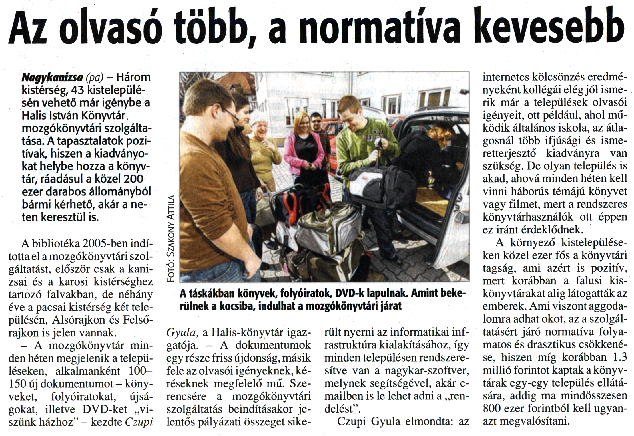 Nyilvános 1906 | 4303 | Zalai Hírlap 2012. március 20. 67. szám 4. oldal - Az olvasó több, a normatíva kevesebb | Az olvasó több, a normatíva kevesebb A táskákban könyvek, folyóiratok, DVD-k lapulnak. Amint bekerülnek a kocsiba, indulhat a mozgókönyvtári járat Nagykanizsa (pa) - Három kistérség, 43 kistelepülésén vehető már igénybe a Halis István Könyvtár mozgókönyvtári szolgáltatása. A tapasztalatok pozitívak, hiszen a kiadványokat helybe hozza a könyvtár, ráadásul a közel 200 ezer darabos állományból bármi kérhető, akár a ne-ten keresztül is. A bibliotéka 2005-ben indította el a mozgókönyvtári szolgáltatást, először csak a kanizsai és a karosi kistérséghez tartozó falvakban, de néhány éve a pacsai kistérség két településén, Alsórajkon és Felsőrajkon is jelen vannak. - A mozgókönyvtár minden héten megjelenik a településeken, alkalmanként 100-150 új dokumentumot - könyveket, folyóiratokat, újságokat, illetve DVD-ket „viszünk házhoz" - kezdte Czupi Fotó: Szakony Attila Gyula, a Halis-könyvtár igazgatója. - A dokumentumok egy része friss újdonság, másik fele az olvasói igényeknek, kéréseknek megfelelő mű. Szerencsére a mozgókönyvtári szolgáltatás beindításakor jelentős pályázati összeget sike- rült nyerni az informatikai infrastruktúra kialakításához, így minden településen rendszeresítve van a nagykar-szoftver, melynek segítségével, akár e-mailben is le lehet adni a „rendelést". Czupi Gyula elmondta: az internetes kölcsönzés eredményeként kollégái elég jól ismerik már a települések olvasói igényeit, ott például, ahol működik általános iskola, az átlagosnál több ifjúsági és ismeretterjesztő kiadványra van szükség. De olyan település is akad, ahová minden héten kell vinni háborús témájú könyvet vagy filmet, mert a rendszeres könyvtárhasználók ott éppen ez iránt érdeklődnek. A környező kistelepüléseken közel ezer fős a könyvtári tagság, ami azért is pozitív, mert korábban a falusi kiskönyvtárakat alig látogatták az emberek. Ami viszont aggodalomra adhat okot, az a szolgáltatásért járó normatíva folyamatos és drasztikus csökkenése, hiszen míg korábban 1.3 millió forintot kaptak a könyvtárak egy-egy település ellátására, addig ma mindösszesen 800 ezer forintból kell ugyanazt megvalósítani. |
